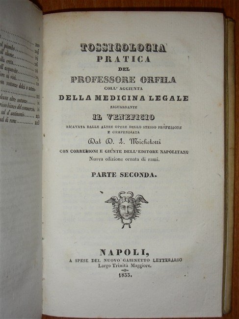 TOSSICOLOGIA PRATICA del professore Orfila coll'Aggiunta della Medicina Legale riguardante il veneficio ricavata dalle altre opere dello stesso professore e compendiata da… Con correzioni e giunte dell'editore Napolitano. Nuova edizione ornata di rami.