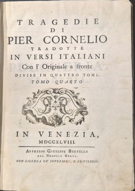 TRAGEDIE DI PIER CORNELIO TRADOTTE IN VERSI ITALIANI Tomo 4 1748 Bertella libro