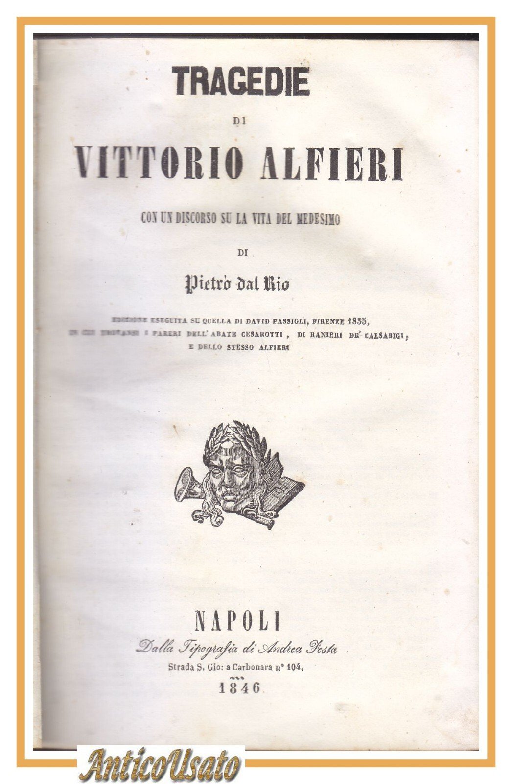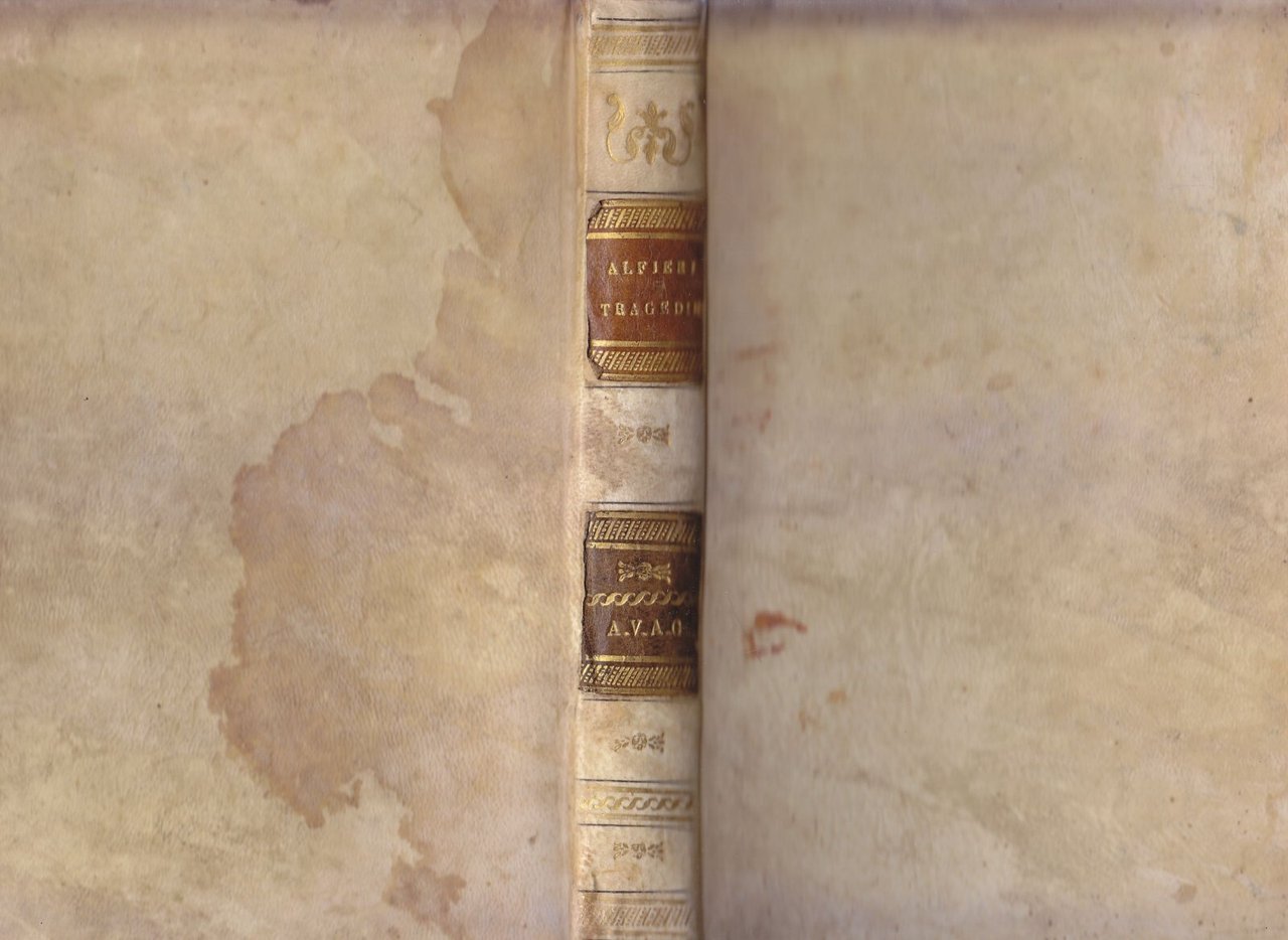 Con un discorso su la vita del Medesimo di Pietro Dal Rio. Edizione eseguita su quella di David Passigli, Firenze 1835, in cui trovansi i pareri dell'Abate Cesarotti, di Ranieri de' Calsabigi e dello stesso Alfieri. 424 pagine, testo su due colonne, due belle tavole in bianco e nero fuori testo e alcune vignette nel testo. copertina coeva in tutta pergamena con titoli dorati entro tasselli al dorso. stato di conservazione: molto buono (pagine normalmente ingiallite, fioriture, macchie alla copertina)