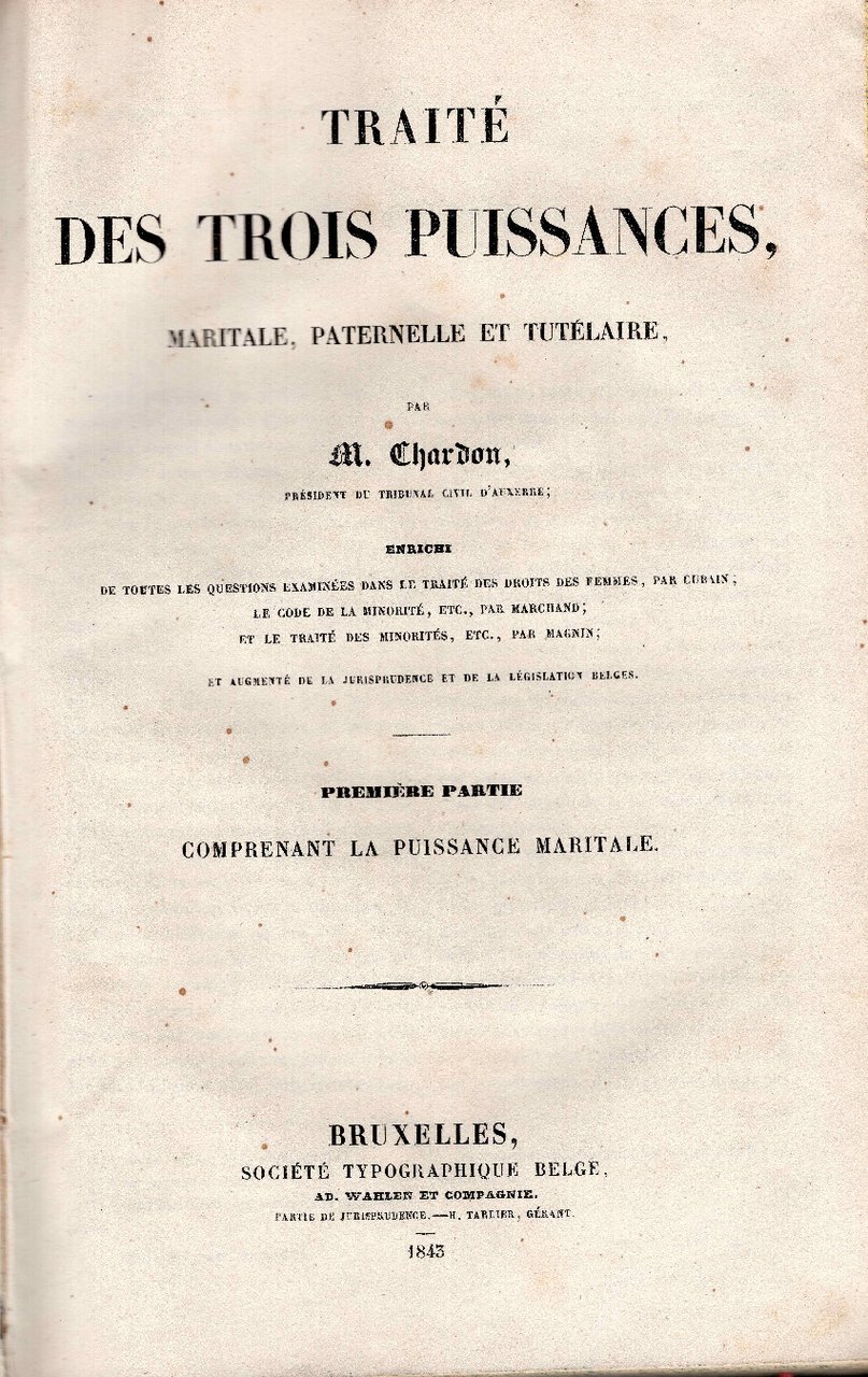 Traite des trois puissances, maritale, paternelle et tutelaire par M. Chardon. Enrichi de toutes les questions examinees dans le traite des droits des femme s par Cubain; le code de la minorite etc. par Marchand; et le traite de minorites etc. par Magnin et augmente de la jurisprudence et de la legislation belges. Tomi 1-3