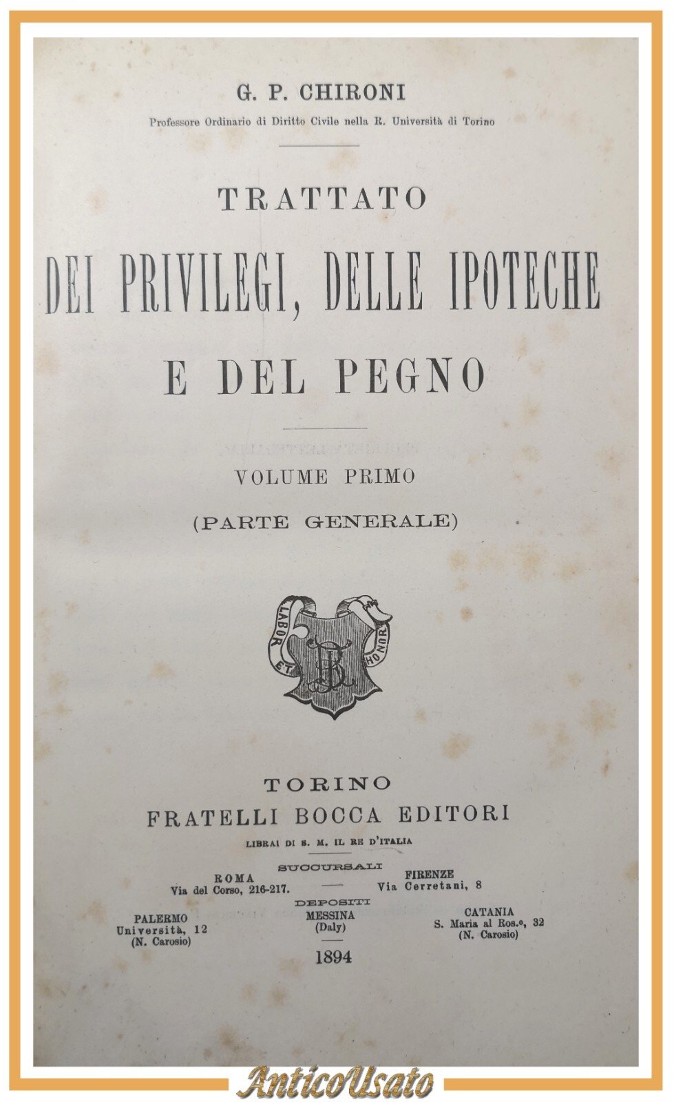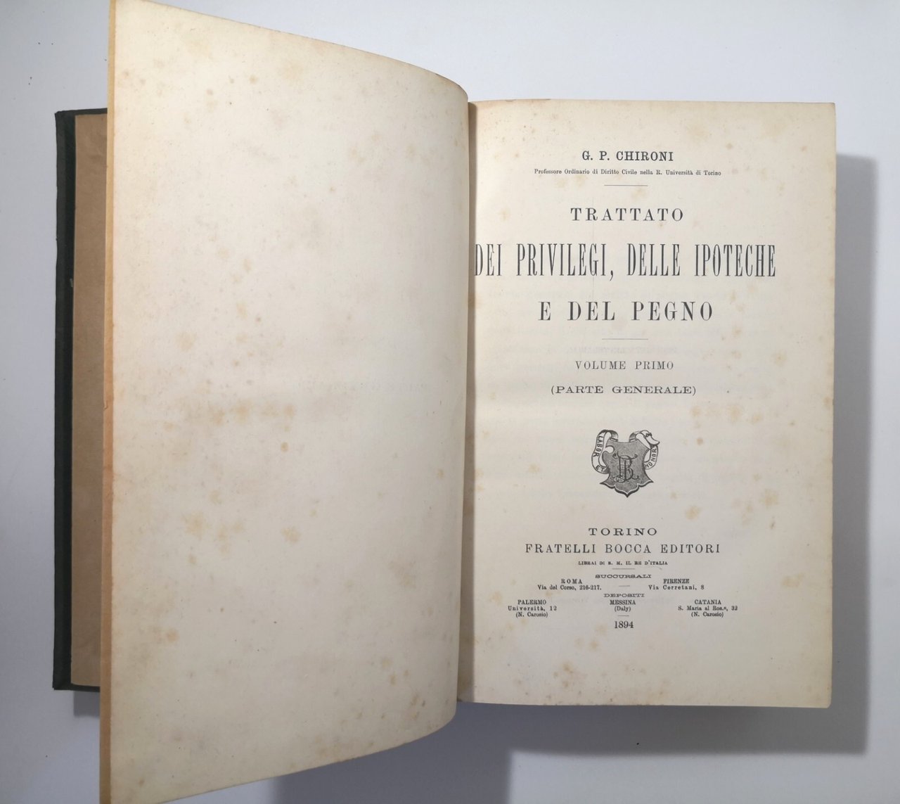 TRATTATO DEI PRIVILEGI DELLE IPOTECHE E PEGNO di Chironi Volume I 1894 Bocca