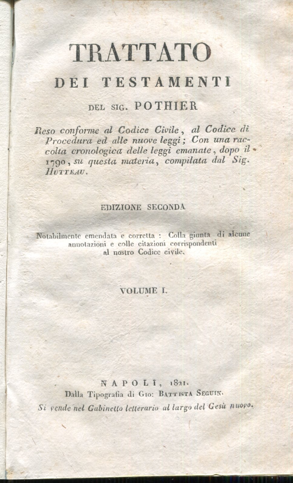 Trattato dei testamenti del sig. Pothier reso conforme al Codice Civile ... dal sig. Hutteau ... Edizione seconda notabilmente emendata e corretta. Volume I