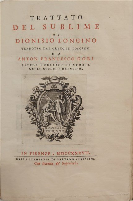 TRATTATO DEL SUBLIME di. tradotto dal Greco in Toscano da Anton Francesco Gori.
