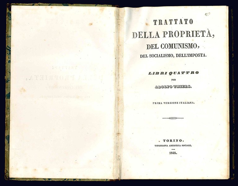 Trattato della proprietá, del comunismo, del socialismo, dell'imposta. Libri quattro per Adolfo Thiers. Prima versione italiana. (insieme a:) Il socialismo. Diritto al lavoro. Risposta al sig. Thiers di Luigi Blanc. Prima versione italiana.