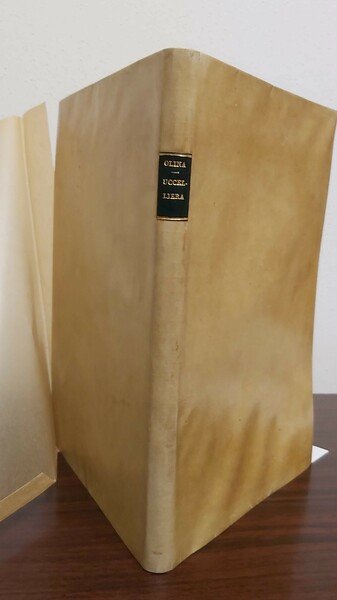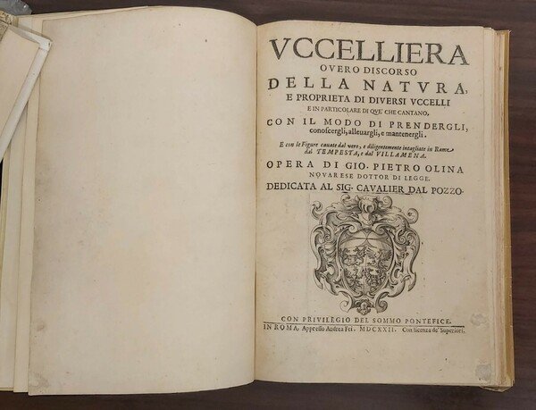 in-4, pp. (12), 81, (12), leg. mod. p. perg. con uso di materiale antico, tass. e tit. oro al d. Con 66 splendide tavv. inc. in rame a p. pag. dal Tempesta e Villamena. Dedicat. a Cassiano Dal Pozzo il cui stemma araldico è inciso in una gr. vignetta in rame al front. Rariss. ediz. orig., solitamente rifilata e mai marginosa e ben conservata come nel nostro esempl. Cicognara 2072. Gamba 2029: “L’Autore, di patria novarese, dedica quest’opera al celebre Cav. Cassiano Dal Pozzo. L’opera è di interesse sia ornitologico che venatorio, dato che l’Olina è considerato anche l’inventore della tecnica di uccellagione “a ragnaja”. Sono descritte molto accuratamente 45 specie di uccelli, ed i modi di prenderli e di conservarli”. Secondo alcuni l’Olina non fu l’originale autore del testo che costituirebbe un adattamento di un precedente poema composto da Valli da Todi e pubblicato a Roma nel 1601, dal titolo “Il canto degl’augelli”. Bacchi della Lega 21. Graesse V, 19. Piantanida 146. Ceresoli p. 384. Brunet IV, 180. Minimo intervento in due punti dell’angolo bianco inf. destro. Bell’esempl. marginoso. [219]