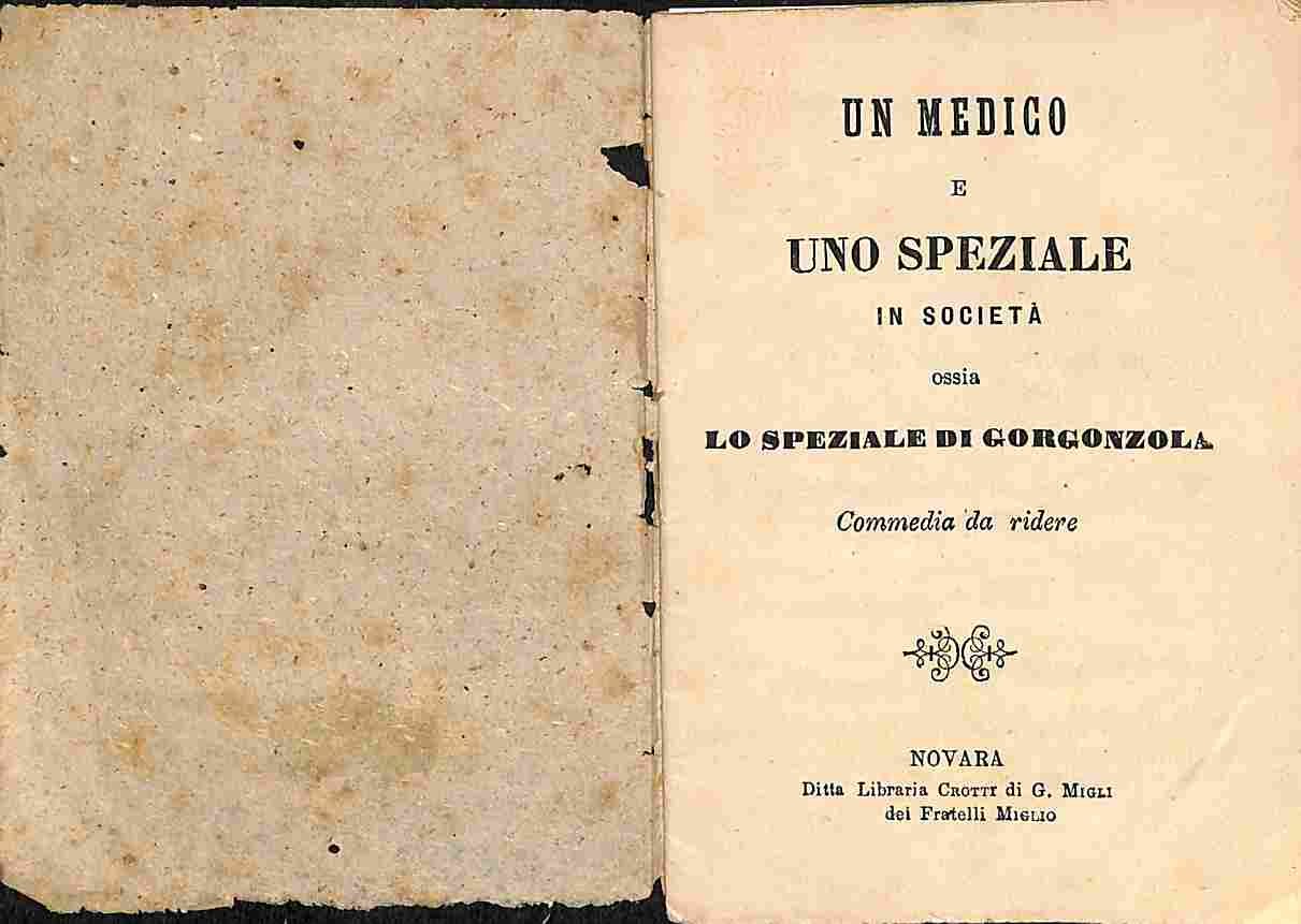 In 24 (cm 10 x 14), pp. 32. Brossura muta coeva. Commedia anonima e non datata, ma ascrivibile al 1860 circa, che ha al centro le vicende di uno speziale (farmacista) di Gorgonzola.