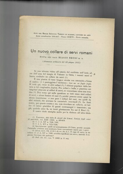 Un nuovo collare dei servi romani (rinvenuto ad Ostia). Estratto dagli Atti del Reale Istituto Veneto di scienze lettere e arti del 1916-1917.