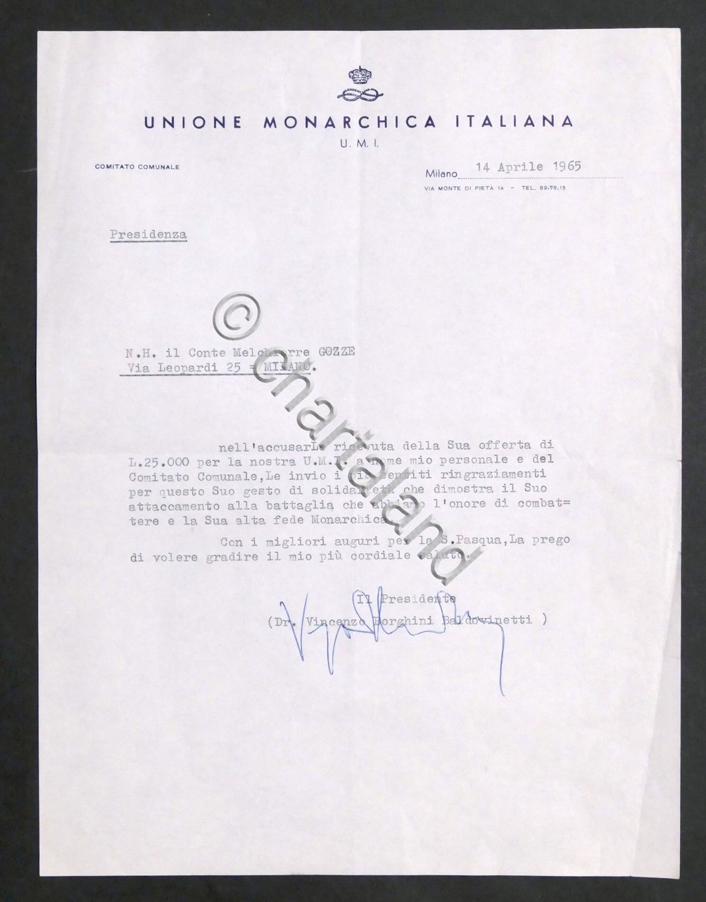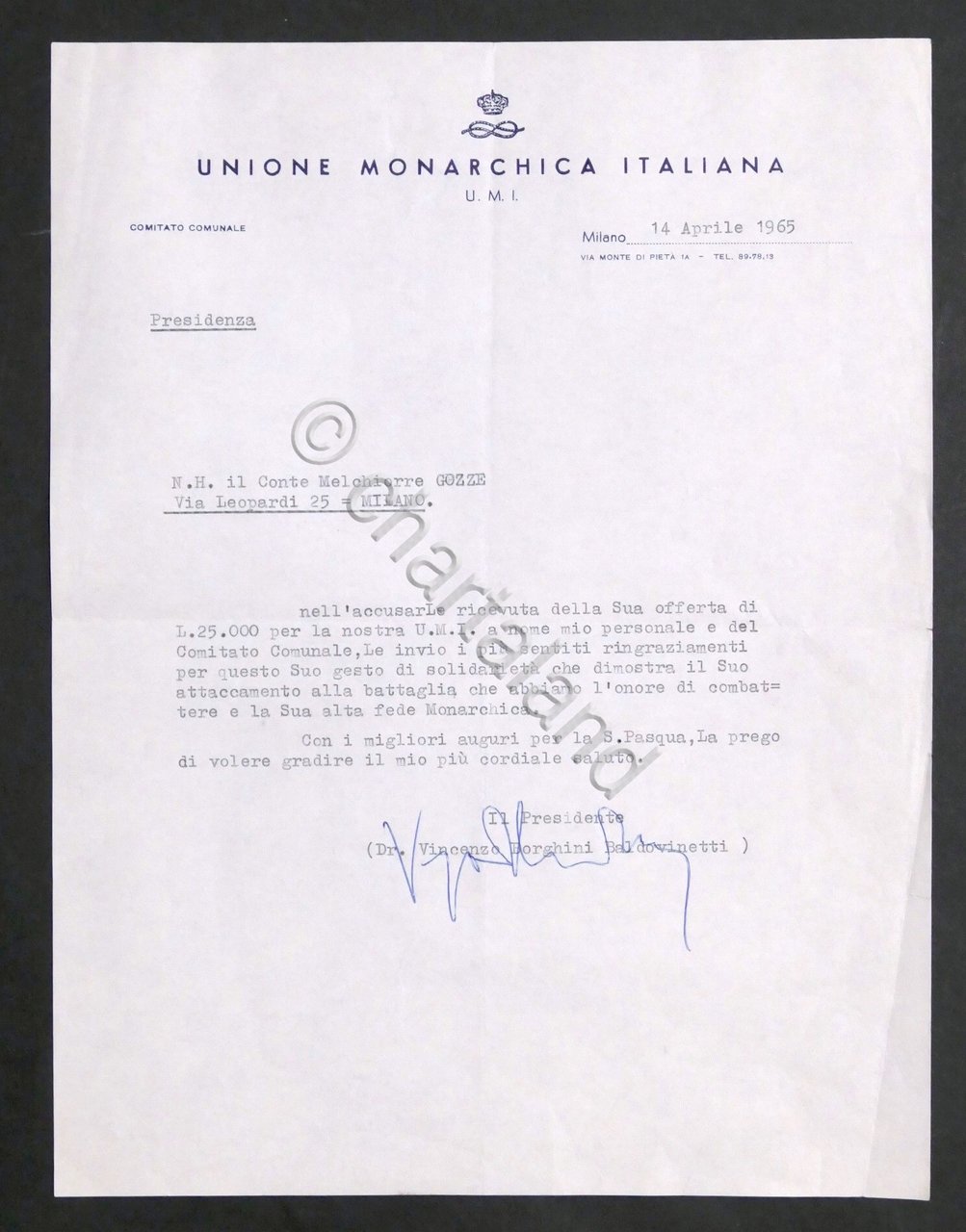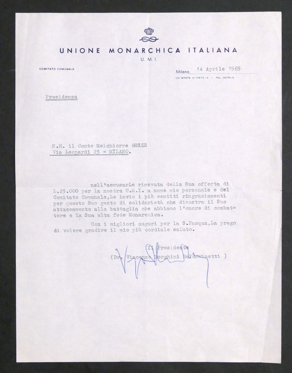 Unione Monarchica Italiana - Autografo del Presidente Vincenzo Borghini Baldovinetti su lettera dattiloscritta datata 14 aprile 1965 Un foglio, dimensioni: 22 x 28 cm ca. Lingua italiana. Condizioni molto buone.