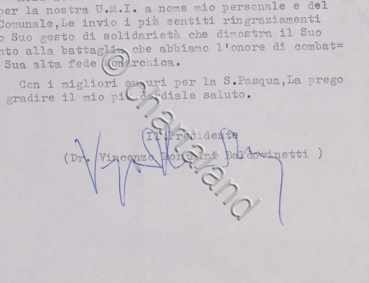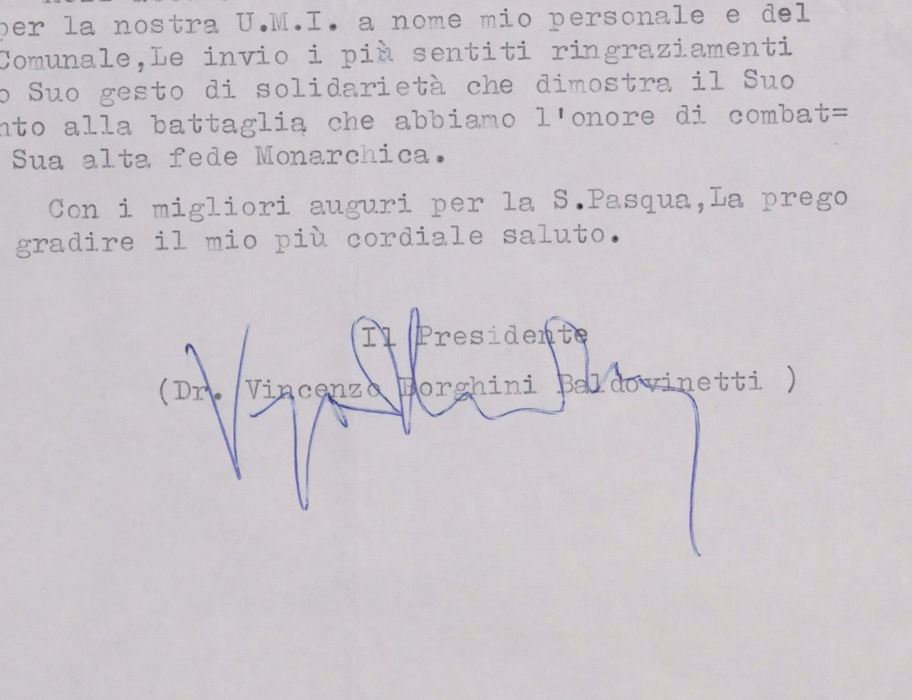 Unione Monarchica Italiana - Autografo Presidente V. Borghini Baldovinetti 1965