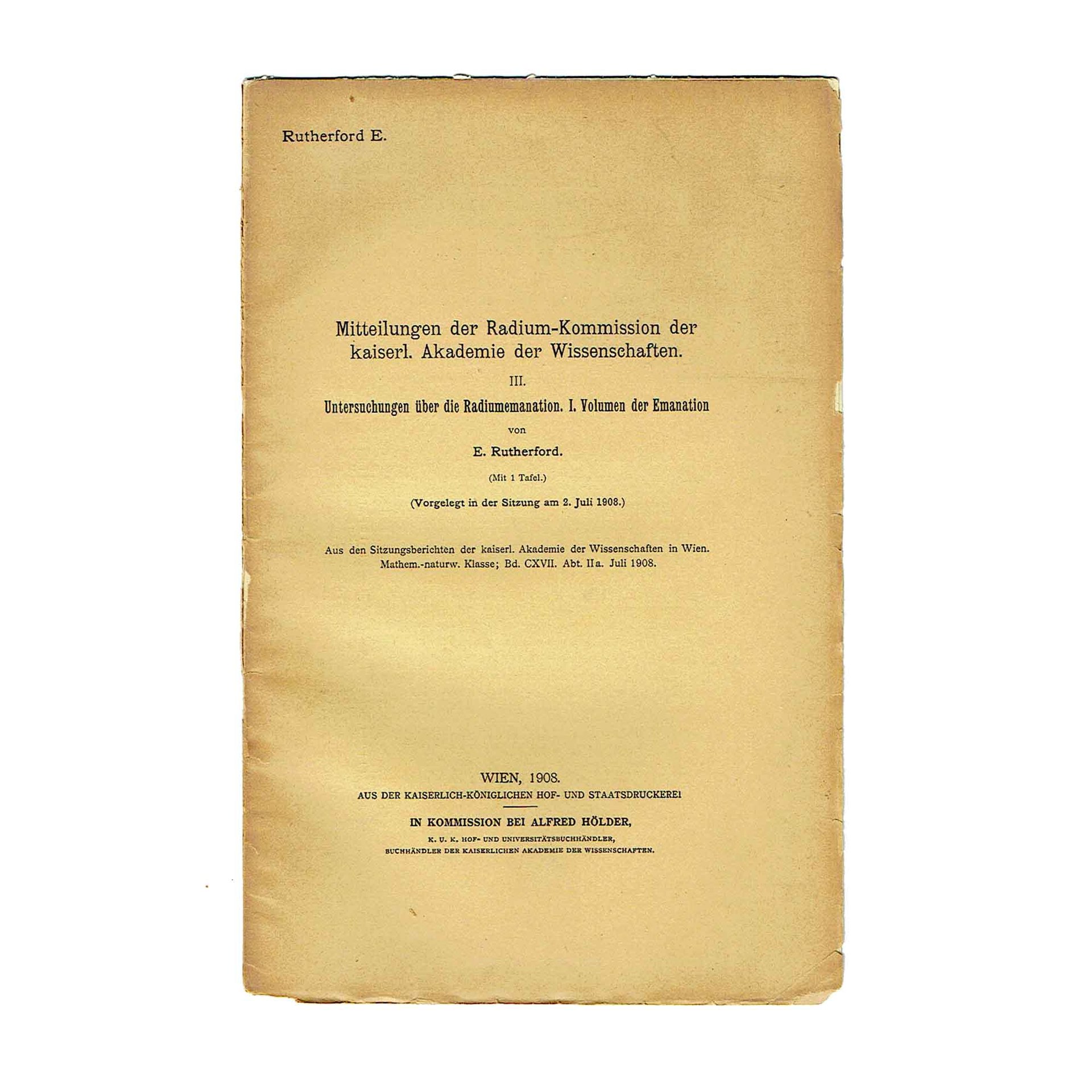 UNTERSUCHUNGEN ÜBER DIE RADIUMEMANATION. [Experiments with the Radium Emanation.] 2 vol.: I. Volumen der Emanation [The Volume of the Emanation.] II. Die Umwandlungsgeschwindigkeit [Conversion Rate]. With 1 plate. Aus den Sitzungsberichten der Kaiserl. Akademie der Wissenschaften in Wien. Mathem.-naturw. Klasse; Bd. CXVII. Abt. IIa. Juli 1908 (I) and Bd. CXX. Abt. IIa. März 1911. (= Mitteilungen der Radium-Kommission der kaiserl. Akademie der Wissenschaften. III and VII).