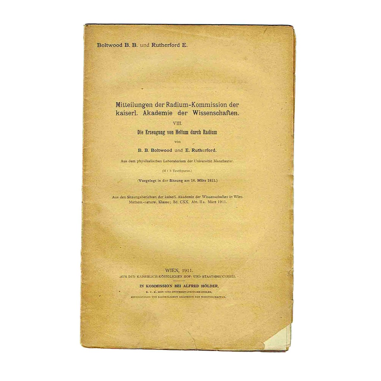 Very scarce first separate printings of three important papers on radium by Ernest Rutherford, the "father of nuclear physics". – Author, Contents: New Zealand-born British nuclear physicist Ernest Rutherford (1871-1937) already had been awarded the Nobel Prize in Chemistry when he moved from McGill University in Montreal to Victoria University of Manchester. To be able to continue his research he was particularly keen to obtain larger quantities of radium. On the other hand in 1905 the Austrian government, then a major player in international efforts to explore radioactivity, had "set up a radium production plant, and two years later it embargoed all exports of uranium ore and products in an attempt to monopolise the market. This continued until about 1913, when other sources could be exploited, for example from Cornwall, Portugal and Colorado." (.) "Thus, when Rutherford moved to Manchester in 1907 Austria was the only place to obtain significant quantities of radium." (Todd) To promote research with the radium at hand the Austrian Academy of Science with the help of investor Karl Kupelwieser, the uncle of Ludwig Wittgenstein, had set up a »Radium-Kommission«, which in 1910 became the famous Vienna Institute for Radium Research (Institut für Radiumforschung). Thanks to his personal contacts to Austrian Chemist Otto Brill Rutherford could organise a considerable quantity of radium in early February 1908 and immediately started experiments to obtain emanation in his laboratory until May 1908. – The documented results of Rutherford's experiments then were first printed simultaneously in the English original as a journal issue (Phil. Mag., vol. 6), as well as in present German translation, this being the first separate printing. The first offprint of the English version was published in August 1908. According to Chadwick et al. the follow up paper from 1911 (»II. Die Umwandlungsgeschwindigkeit«) was first published in German translation first, as present separate printing by the Austrian Academy, as this is true for the 3rd paper of this lot (see enclosed). – ENCLOSED: Ernest Rutherford and Bertram B. Boltwood: Die Erzeugung von Helium durch Radium. [The Generation of Helium through Radium.] Aus dem physikalischen Laboratorium der Universität Manchester. With 3 text illustrations. Aus den Sitzungsberichten der Kaiserl. Akademie der Wissenschaften in Wien. Mathem.-naturw. Klasse; Bd. CXX. Abt. IIa. März 1911. (= Mitteilungen der Radium-Kommission der kaiserl. Akademie der Wissenschaften. VIII). – Condition: Front wrapper of the 1908 paper in parts loose, front wrapper of the 1911 paper on Helium with one small chip, wrappers at margins with some small tears and time-stained, otherwise well preserved, in parts uncut set of 3 issues. – Rarity: RBH show no auction results at all. –Reference: James Chadwick et al., ed.: The Collected Papers of Lord Rutherford of Nelson. Vol. 2: Manchester. New York: Interscience (Wiley) 1963; Todd N. A brief history of Lord Rutherford's radium. Notes Rec R Soc Lond. 2014;68(3):279-300, cit. p. 284 and p. 286 (sketch of the apparatus). doi:10.1098/rsnr.2013.0070; Ernest Rutherford: Experiments with the Radium Emanation. I. The volume of the Emanation. In: »The London, Edinburgh and Dublin philosophical magazine and journal of science«, ser. 6, vol. 16 (1908), pp. 300-312)