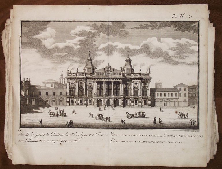 Tratta dall'opera: "La sontuosa illuminazione della città di Torino". Torino, Chias G.B., 1737 per l'augusto sposalizio delle Reali Maestà di Carlo Emmanuele Re di Sardegna e di Elisabetta Teresa principessa primogenita di Lorena. Raccolta di 14 tavole a doppia pagina, disegnate e inc. in rame da vari artisti (Vittone, Masson, Agliaudi, Daudet, Belmondo, de Prenner, Herriset) raffiguranti stupende vedute di Torino «illuminata» per il festoso sposalizio (Veduta della Porta del Po; Contrada del Po; Castello Reale verso la strada del Po, Macchina de Fuochi di Gioia, Facciata e laterali del Castello dalla parte della Dora, Veduta geometrica del Padiglione Reale, Piazza e Palazzo Reale; Piazza San Carlo; Palazzo di Città, Chiesa del Corpus Domini; Il Ghetto; Esposizione della Sindone; Vigna della Regina; Giardino della Venaria Reale). Bell'esemplare. Cfr. Peyrot, Torino nei secoli, n. 151/5. Ruggieri 848. Lipperheide S144. Berlin Cat. 3072. 1