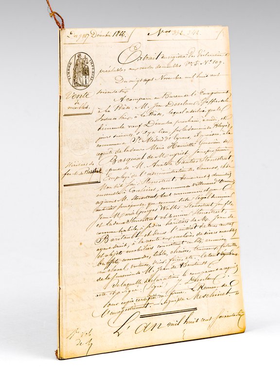 Vente aux enchères après décès, le 9 décembre 1866, Domaine du Blayès, Saint-Médard-d'Eyrans. Extrait du registre des Déclarations préalables aux ventes de meubles. Vente à la requête de Mme Marie Henriette Geneviève de Basquiat de Mongriet et de M. Stonestreet demeurant à Couhins, Villenave-d'Ornon, héritiers de M. Jean de Baritault, par le Ministère de Me Desclaux, greffier à La Brède [ Avec le détail de l'inventaire, les noms des adjudicataires et les prix d'adjudication ]