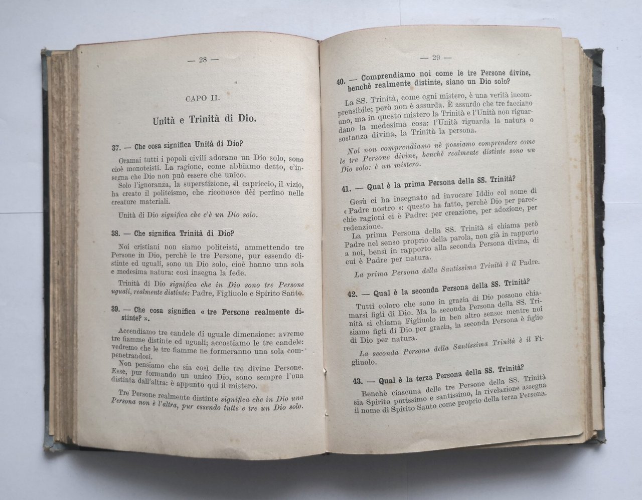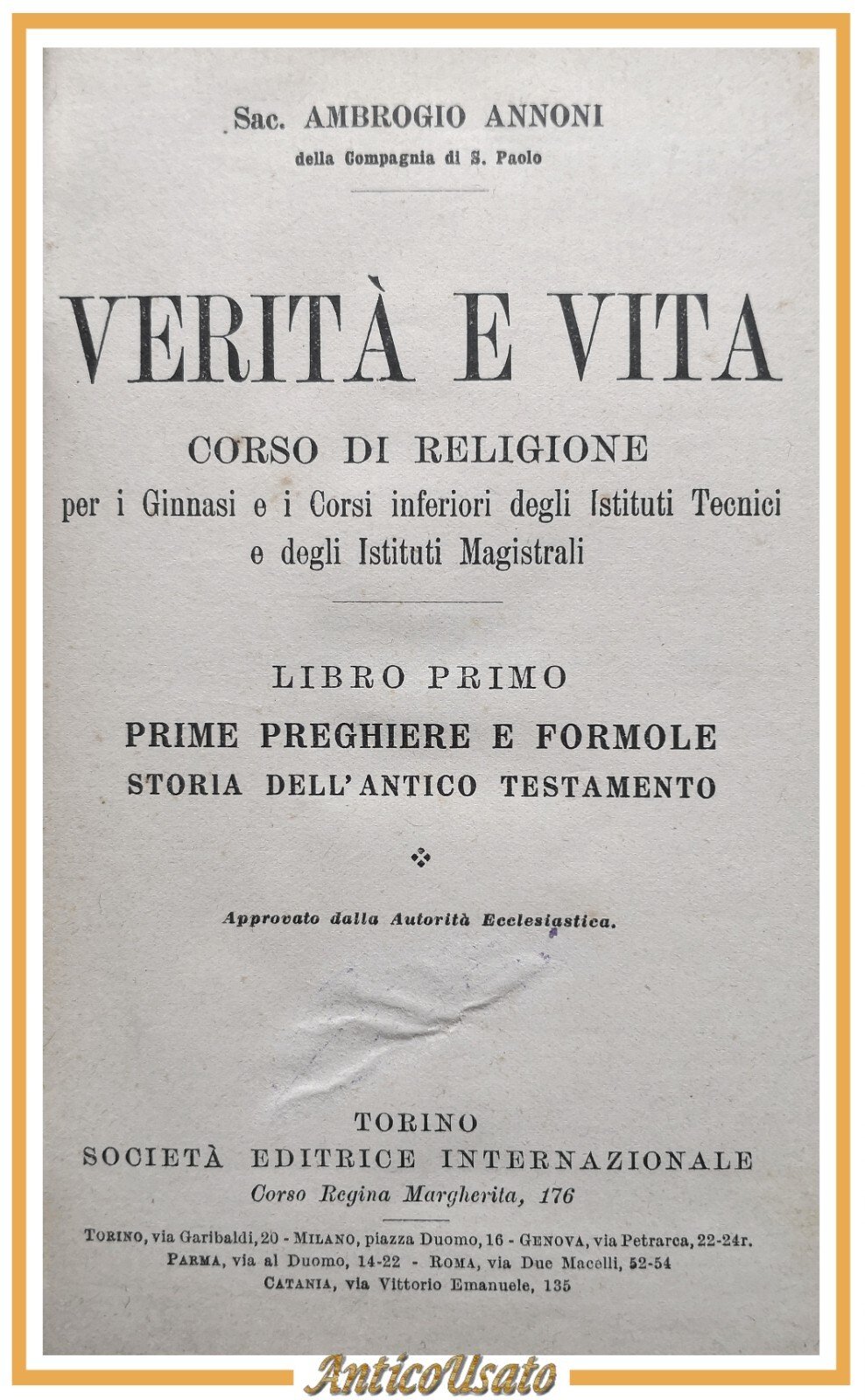 VERITÀ E VITA corso di religione di Ambrogio Annoni. Tre volumi rilegati in uno. Libro I - Prime preghiere e formole. Storia dell'antico Testamento. Libro II: la fede, storia del nuovo testamento. Libro III: la legge, storia della chiesa. per Ginnasi e istituti magistrali e tecnici. Società Editrice Internazionale, 1931.145 + 180 + 152 pagine. Copertina coeva in mezza tela. Stato di conservazione: buono (pagine normalmente ingiallite, firma di appartenenza cancellata, copertina un po' sciupata) Libro usato saggistica