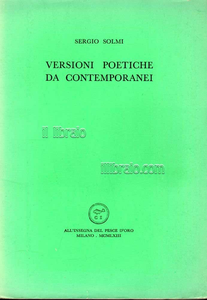 in 16°; pp. 108; br.; coll. Acquario, n° 15. Dieci poeti del '900 tradotti da Sergio Solmi: P. Valéry, J. Cocteau, A. Machado, J. Moreno Villa, R. Alberti, E. Muir, W. H. Auden, S. Spender, Ezra Pound, A. Mac Leish. Testo italiano - francese - spagnolo - inglese. Tiratura di 1000 esemplari numerati (ns. 958)