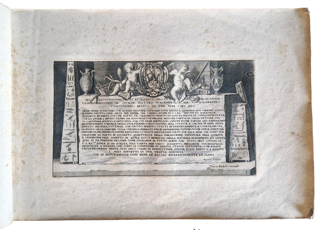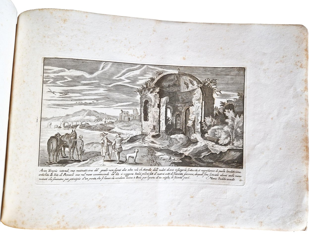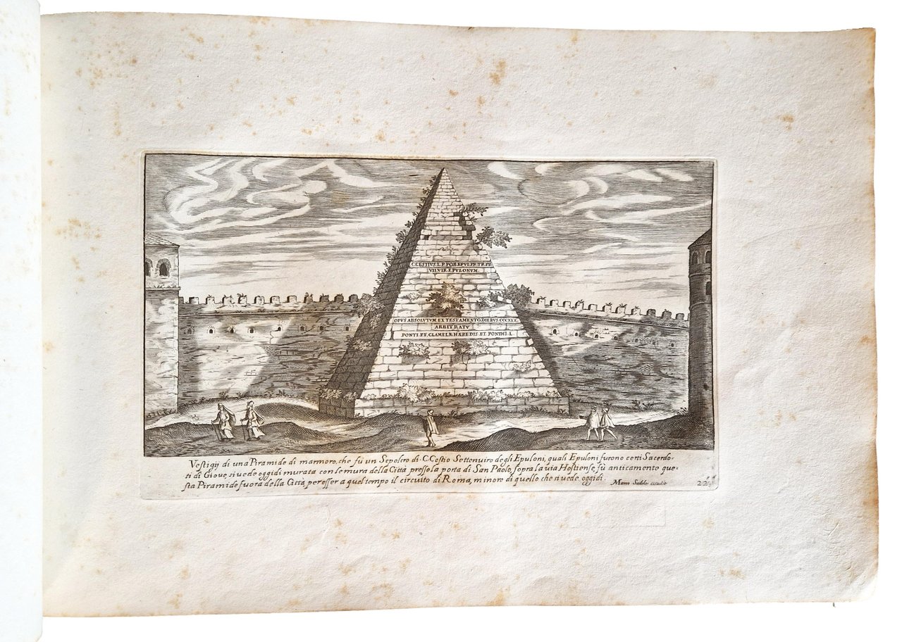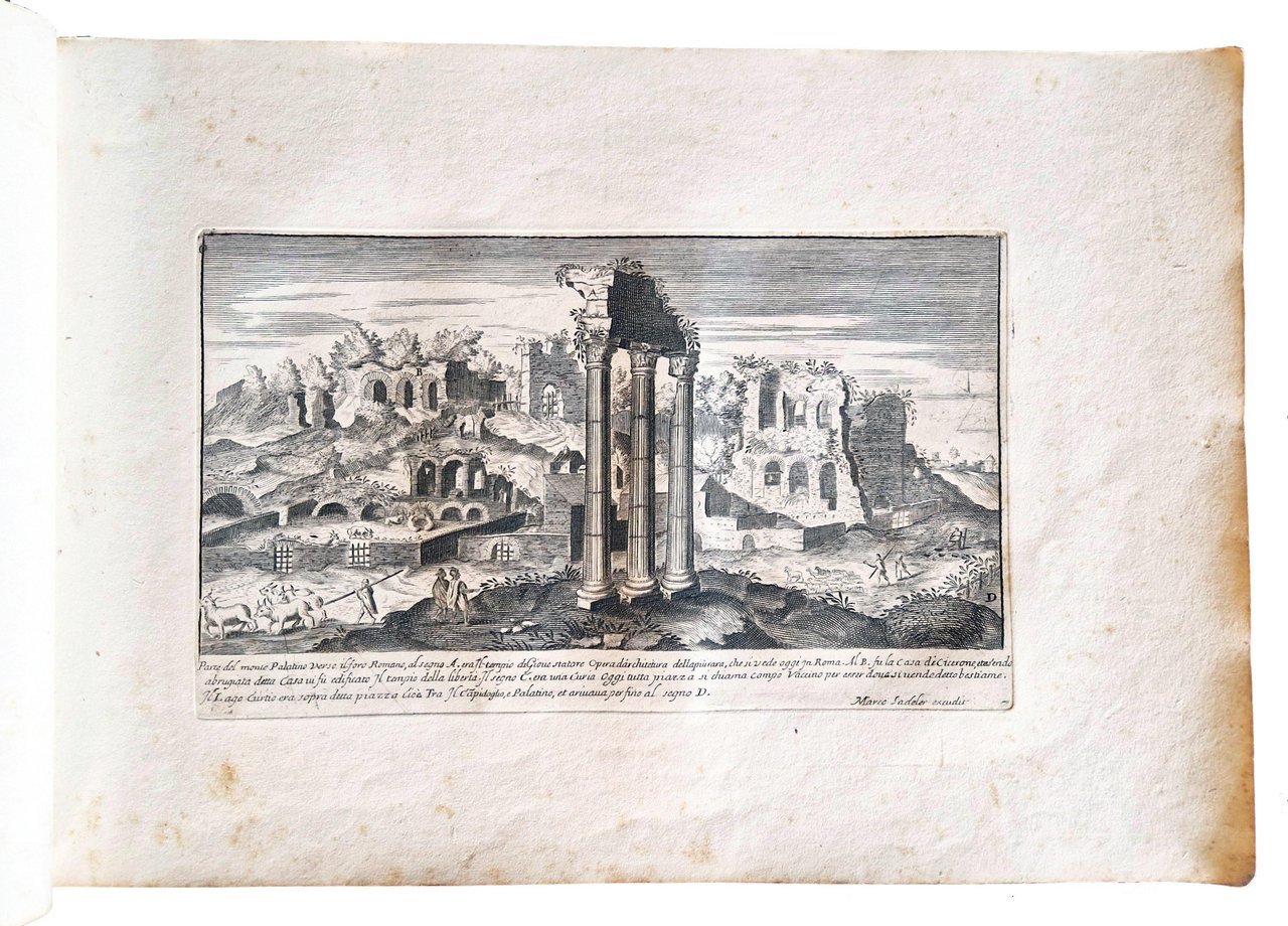 in-4° oblungo, 193x260 mm, leg. in brossura (cartonato muto azzurro-verde); 1 frontespizio architettonico e 50 tavole numerate finemente incise in rame, inclusa la prima tavola con la dedica a Johann Matthaus Waeckher. Ristampa di metà '800 a cura della Regia Calcografia Romana della edizione del 1660 curata da Marcus Sadeler, che riprese le tavole realizzate dallo zio, il pittore e incisore fiammingo Aegidius Sadeler (1570-1629) per l'edizione stampata a Praga nel 1606. Le tavole furono tutte incise di nuovo, tranne il frontespizio che riporta l'indirizzo della prima edizione. Frontespizio architettonico allegorico inciso con la firma dell'Autore, "Marco Sadeler sculpsit" e con il titolo del libro inciso su una pelle di lupo appesa a un monumento sullo sfondo, fiancheggiato dalle figure di un angelo a sinistra, che tiene in alto una tromba, e il Tempo a destra, raffigurato come un vecchio barbuto con in mano una falce. La prima tavola riporta la dedica firmata "Aegidio Sadeler" al suo mecenate, "Signor Matteo Wackhero da Wackhenfels" (Johann Matthaus Wacker von Wackerfels); il testo della dedica è inciso su una tavoletta di pietra fiancheggiata ai lati da obelischi; sopra la tavoletta sono seduti due putti, circondati da libri, strumenti scientifici e urne, che sorreggono uno scudo recante lo stemma del dedicatario. Le tav. con vedute di Roma sono copie da: E. Duperac, I vestigi dell'antichita di Roma, Roma 1575. Ogni singola stampa riporta in basso il testo esplicativo e la firma "Marco Sadeler excudit" o "Marco Sadler escud." o "Marco Sadeler excu". Le tavole mostrano vedute delle rovine di templi romani, archi di trionfo, del Palatino, delle terme e di altri edifici a Roma e nei dintorni. Oltre alle vedute di Roma, la serie comprende anche alcune tavole di rovine e vedute del Golfo di Napoli e dintorni: il Golfo di Baia, Cuma, il Lago Averno, i Campi Flegrei, Capo Miseno e la Villa Agrippina a Oplonti e altri luoghi entro i confini di Pozzuoli. Rif.: IT\ICCU\BVE\0701101. OCLC, 79432822 e 26927075. Cond.: Segni d'uso alla legatura (mancanze della carta al dorso, macchie, arricciamenti agli angoli). Fioriture diffuse alle tavole e bruniture al frontespizio. Arricciamenti agli angoli esterni di alcune tavole. Esemplare comunque in buone condizioni generali. -- MID-19TH CENTURY REPRINT BY THE REGIA CALCOGRAFIA ROMANA OF THE 1660 EDITION EDITED BY MARCUS SADELER, who took up the plates made by his uncle, the Flemish painter and engraver Aegidius Sadeler for the edition printed in Prague in 1606. The 50 plates show views of the ruins of Roman temples, triumphal arches, the Palatine, the baths and other buildings in Rome and its surroundings. In addition to the views of Rome, the series also includes some plates of ruins and views of the Gulf of Naples and its surroundings: the Gulf of Baia, Cumae, Lake Avernus, the Phlegraean Fields, Cape Misenum and the Villa Agrippina at Oplontis and other places within the boundaries of Pozzuoli. Good copy.