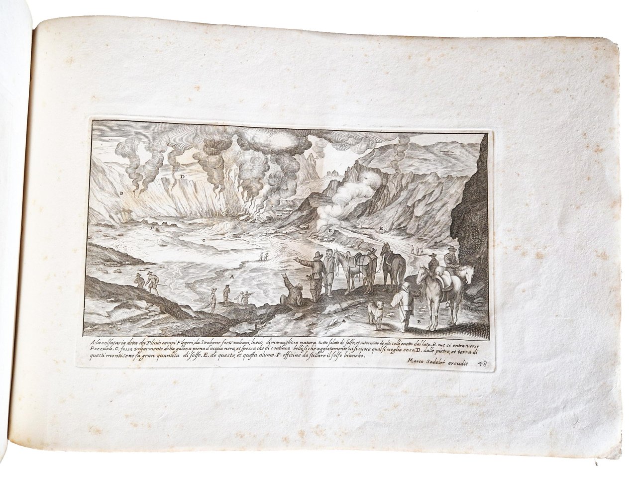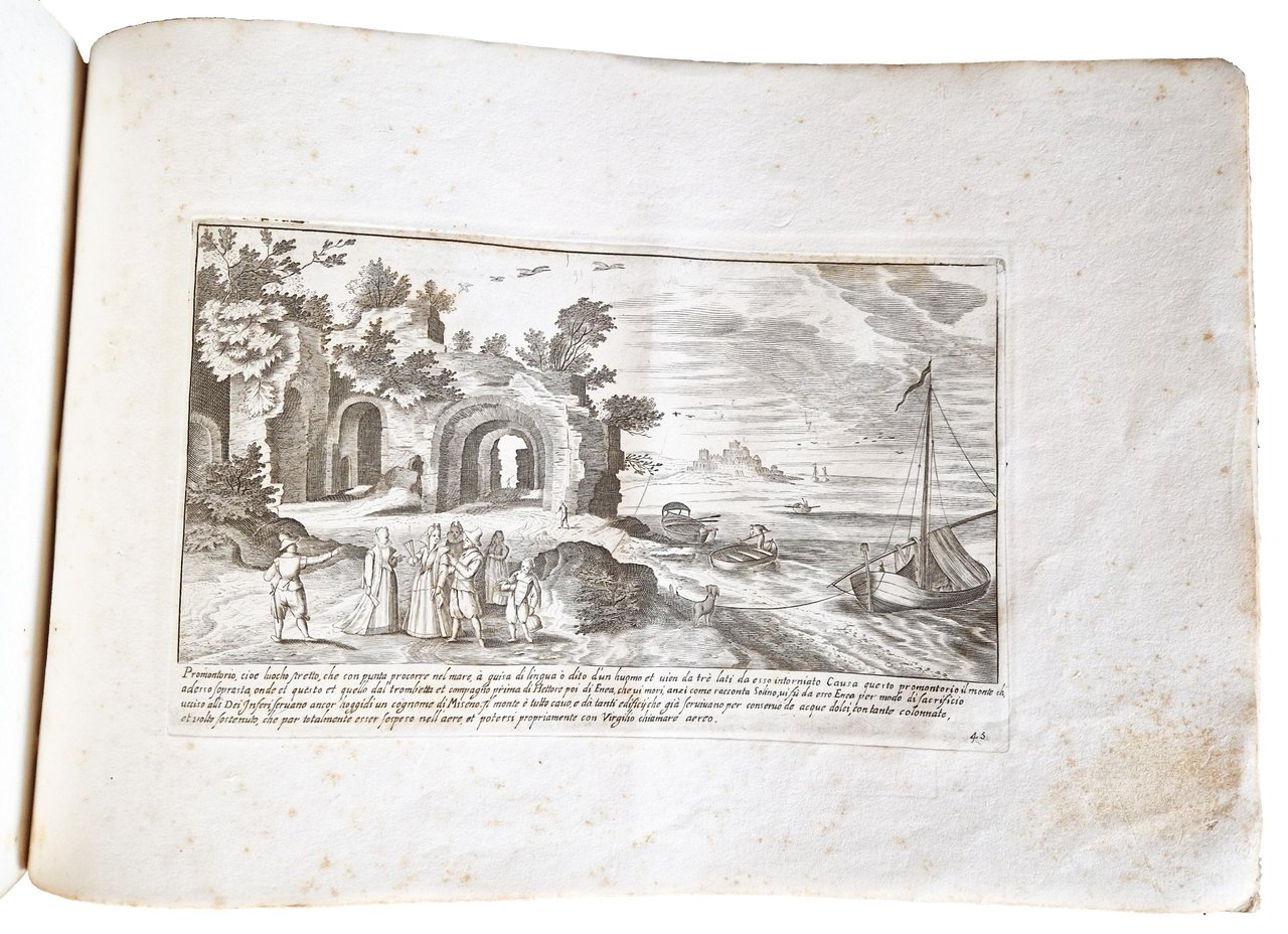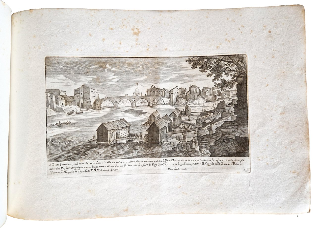in-4° oblungo, 193x260 mm, leg. in brossura (cartonato muto azzurro-verde); 1 frontespizio architettonico e 50 tavole numerate finemente incise in rame, inclusa la prima tavola con la dedica a Johann Matthaus Waeckher. Ristampa di metà '800 a cura della Regia Calcografia Romana della edizione del 1660 curata da Marcus Sadeler, che riprese le tavole realizzate dallo zio, il pittore e incisore fiammingo Aegidius Sadeler (1570-1629) per l'edizione stampata a Praga nel 1606. Le tavole furono tutte incise di nuovo, tranne il frontespizio che riporta l'indirizzo della prima edizione. Frontespizio architettonico allegorico inciso con la firma dell'Autore, "Marco Sadeler sculpsit" e con il titolo del libro inciso su una pelle di lupo appesa a un monumento sullo sfondo, fiancheggiato dalle figure di un angelo a sinistra, che tiene in alto una tromba, e il Tempo a destra, raffigurato come un vecchio barbuto con in mano una falce. La prima tavola riporta la dedica firmata "Aegidio Sadeler" al suo mecenate, "Signor Matteo Wackhero da Wackhenfels" (Johann Matthaus Wacker von Wackerfels); il testo della dedica è inciso su una tavoletta di pietra fiancheggiata ai lati da obelischi; sopra la tavoletta sono seduti due putti, circondati da libri, strumenti scientifici e urne, che sorreggono uno scudo recante lo stemma del dedicatario. Le tav. con vedute di Roma sono copie da: E. Duperac, I vestigi dell'antichita di Roma, Roma 1575. Ogni singola stampa riporta in basso il testo esplicativo e la firma "Marco Sadeler excudit" o "Marco Sadler escud." o "Marco Sadeler excu". Le tavole mostrano vedute delle rovine di templi romani, archi di trionfo, del Palatino, delle terme e di altri edifici a Roma e nei dintorni. Oltre alle vedute di Roma, la serie comprende anche alcune tavole di rovine e vedute del Golfo di Napoli e dintorni: il Golfo di Baia, Cuma, il Lago Averno, i Campi Flegrei, Capo Miseno e la Villa Agrippina a Oplonti e altri luoghi entro i confini di Pozzuoli. Rif.: IT\ICCU\BVE\0701101. OCLC, 79432822 e 26927075. Cond.: Segni d'uso alla legatura (mancanze della carta al dorso, macchie, arricciamenti agli angoli). Fioriture diffuse alle tavole e bruniture al frontespizio. Arricciamenti agli angoli esterni di alcune tavole. Esemplare comunque in buone condizioni generali. -- MID-19TH CENTURY REPRINT BY THE REGIA CALCOGRAFIA ROMANA OF THE 1660 EDITION EDITED BY MARCUS SADELER, who took up the plates made by his uncle, the Flemish painter and engraver Aegidius Sadeler for the edition printed in Prague in 1606. The 50 plates show views of the ruins of Roman temples, triumphal arches, the Palatine, the baths and other buildings in Rome and its surroundings. In addition to the views of Rome, the series also includes some plates of ruins and views of the Gulf of Naples and its surroundings: the Gulf of Baia, Cumae, Lake Avernus, the Phlegraean Fields, Cape Misenum and the Villa Agrippina at Oplontis and other places within the boundaries of Pozzuoli. Good copy.