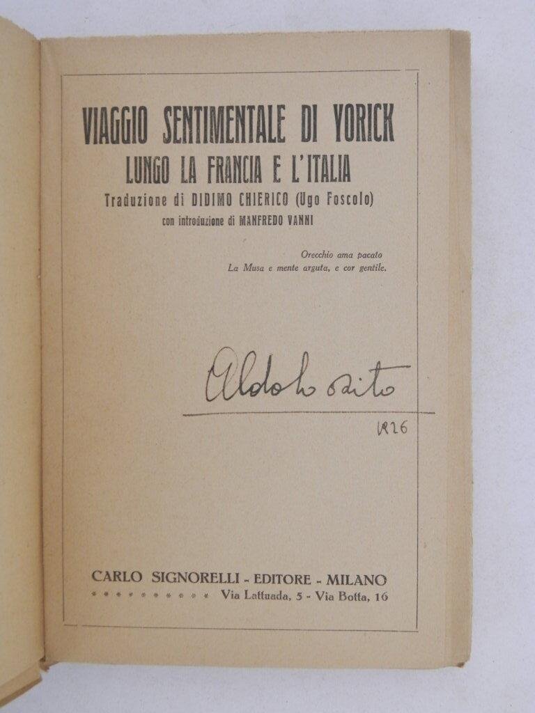 Viaggio sentimentale di Yorick Lungo la Francia e l'Italia. Traduzione di Didimo Chierico ( Ugo Foscolo ), con Introduzione di Manfredo Vanni | Livres anciens et modernes | Sterne, Laurence