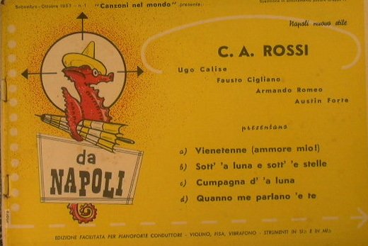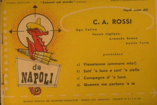 Autori: Nisa, Rossi C. A., Calise, Cigliano Fausto - Presentate da ' Canzoni nel mondo ' - Napoli nuovo stile - in 8° - pp.11 + 11 - Brossura editoriale illustrata - Partitura per Pianoforte e Violino/Fisarmonica/Vibrafono