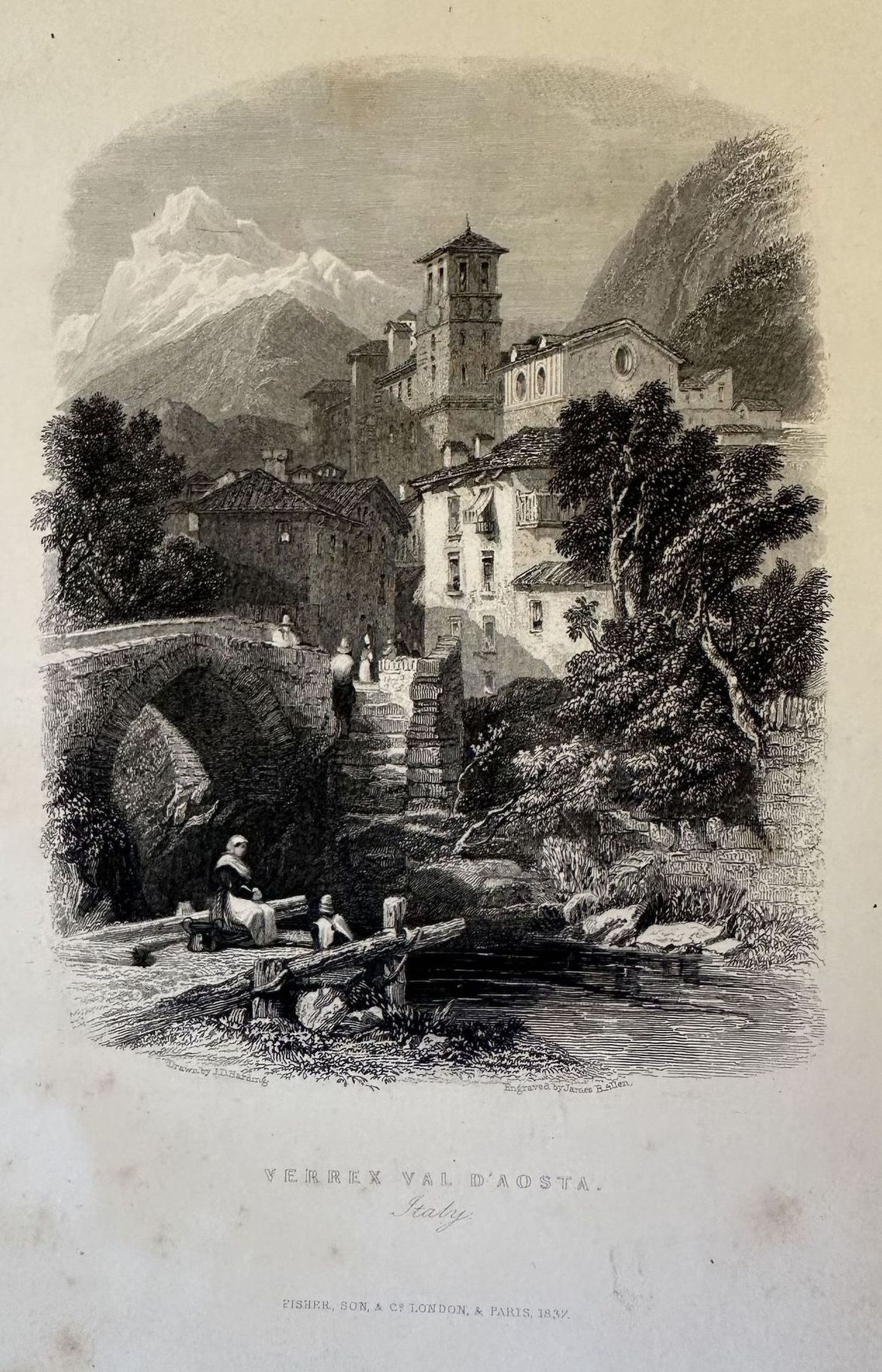 Finissima veduta di Verres in Valle D'aosta del 1837 incisa da James Ballen su disegno di J. D. Harding. Autore: James Ballen su disegno di J. D. Harding Data: 1837 Tecnica: Acquaforte Dimensione del foglio: 250x175 mm Dimensione incisione: 225x150 mm Condizioni: Buone. Rare fioriture.Very fine view of Verres in Valle D'aosta of 1837 engraved by James Ballen after J. D. Harding Author: James Ballen after J. D. Harding Date: 1837 Technique: etching Leaf Dimension: 250x175 mm Engraving Dimension: 225x150 mm Conditions: Good conditions. Occasional foxing.