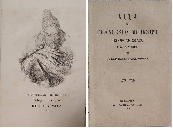 in-16, pp. 166, (2), leg. m. tela coeva, piatti in cart. dec. Antip. con ritr. litogr. del Morosini. Biografia del Morosini, doge e comandante delle flotte veneziane nelle guerre contro i Turchie, belle pagine di storia veneziana nell'arco del XVII sec. Raro. [195]