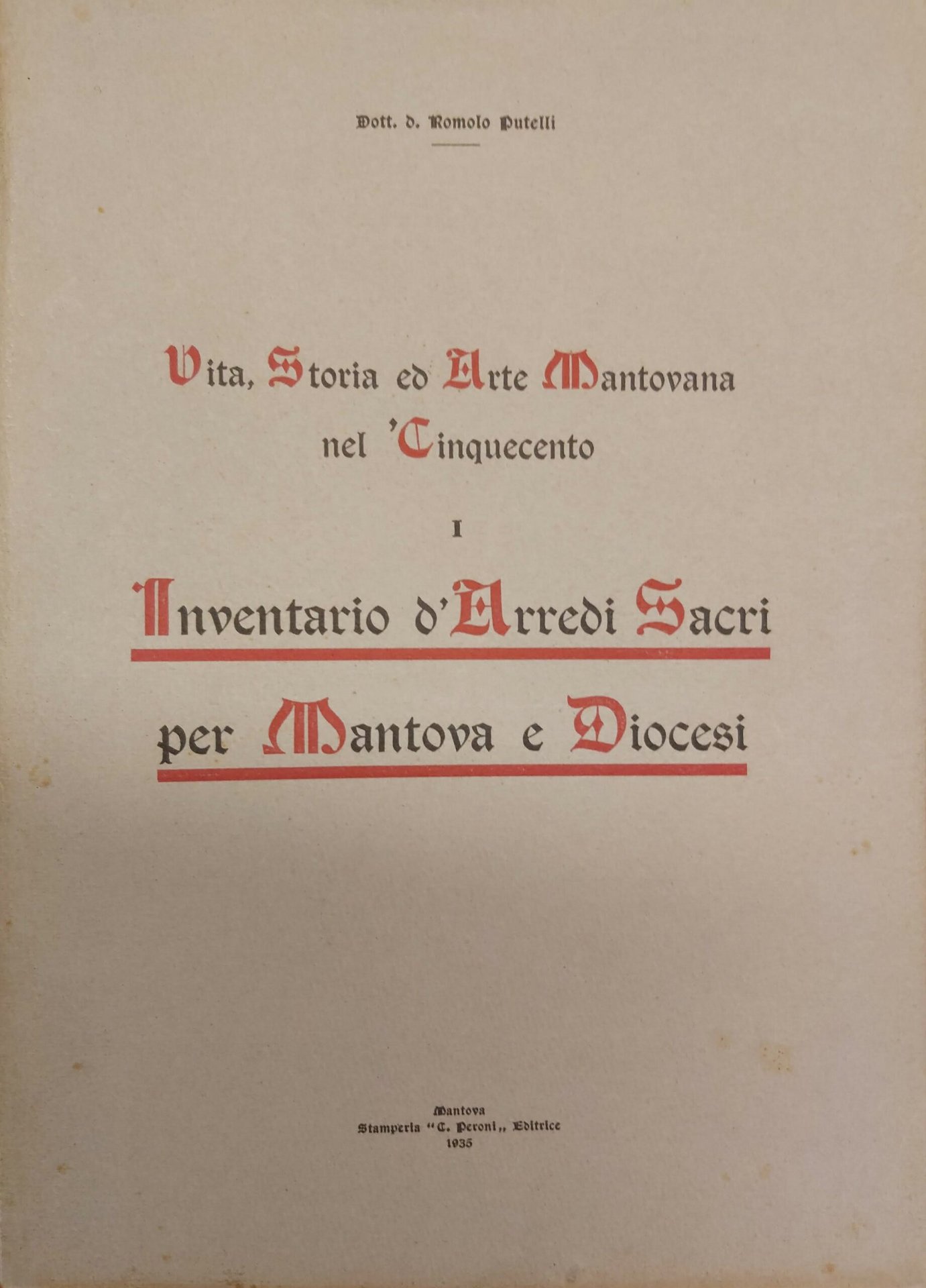 2 voll. in-8 gr., pp. 246; 215, bross. edit. Imp. studio dedicato a Monsignor Menna. Dalla prefazione: "Gli inventari che ora si pubblicano sono tutti del secolo XVI sia perchè delle antecedenti epoche siffatti documenti mancano quasi del tutto, sia perchè il "secol d'oro" fu a Mantova felicissimo per l'Arte e pel mecenatismo "sacro". Qualche lieve sottolineatura a penna rossa al secondo vol. [374]
