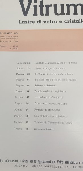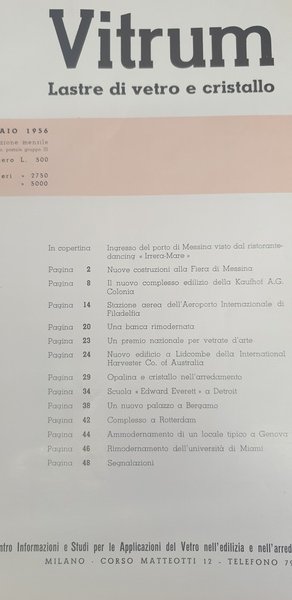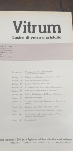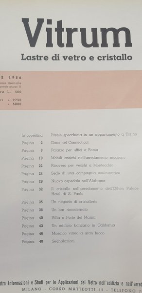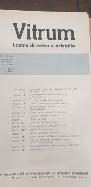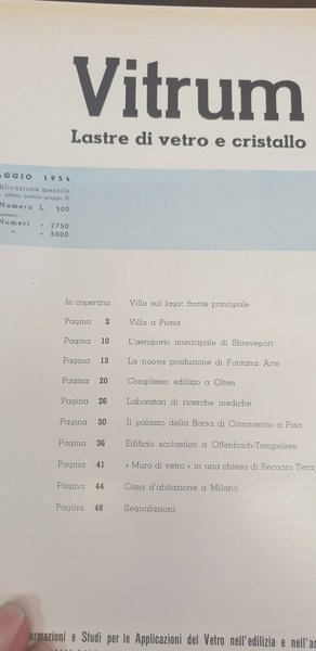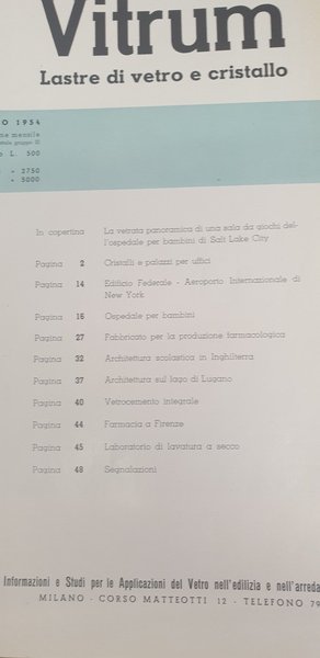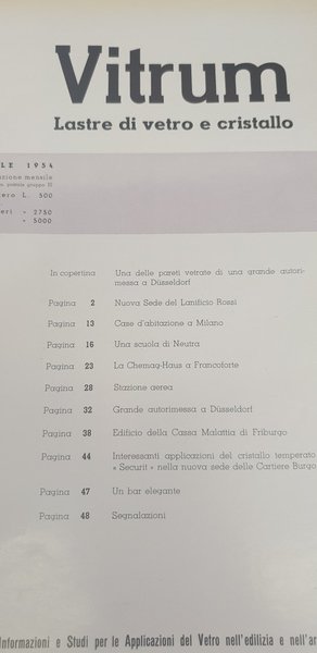 Vitrum lastre di vetro e cristallo, rivista mensile di studi per le applicazioni del vetro nell'edilizia e nell'arredamento annata completa 1954.