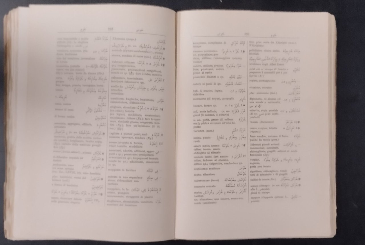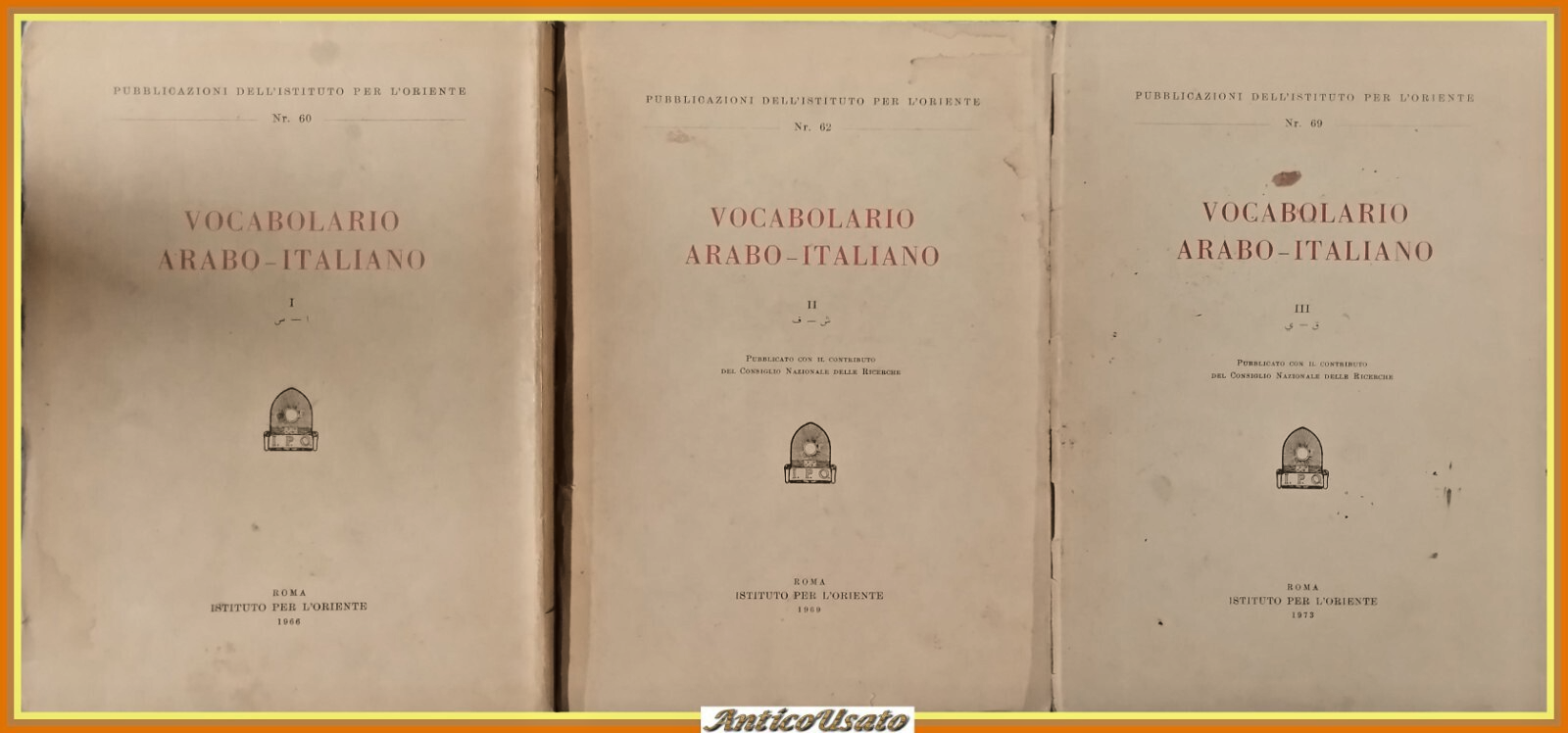 VOCABOLARIO ARABO ITALIANO opera completa in 3 volumi. Pubblicato con il contributo del Consiglio Nazionale delle Ricerche. Istituto Per L'Oriente Editore, 1969 1973. 640 + 1124 + 1763 pagine. Copertine editoriali in brossura. Stato di conservazione: molto buono (pagine normalmente ingiallite, pasticcetti a penna alle copertine) Libro usato saggistica linguistica lingua straniera