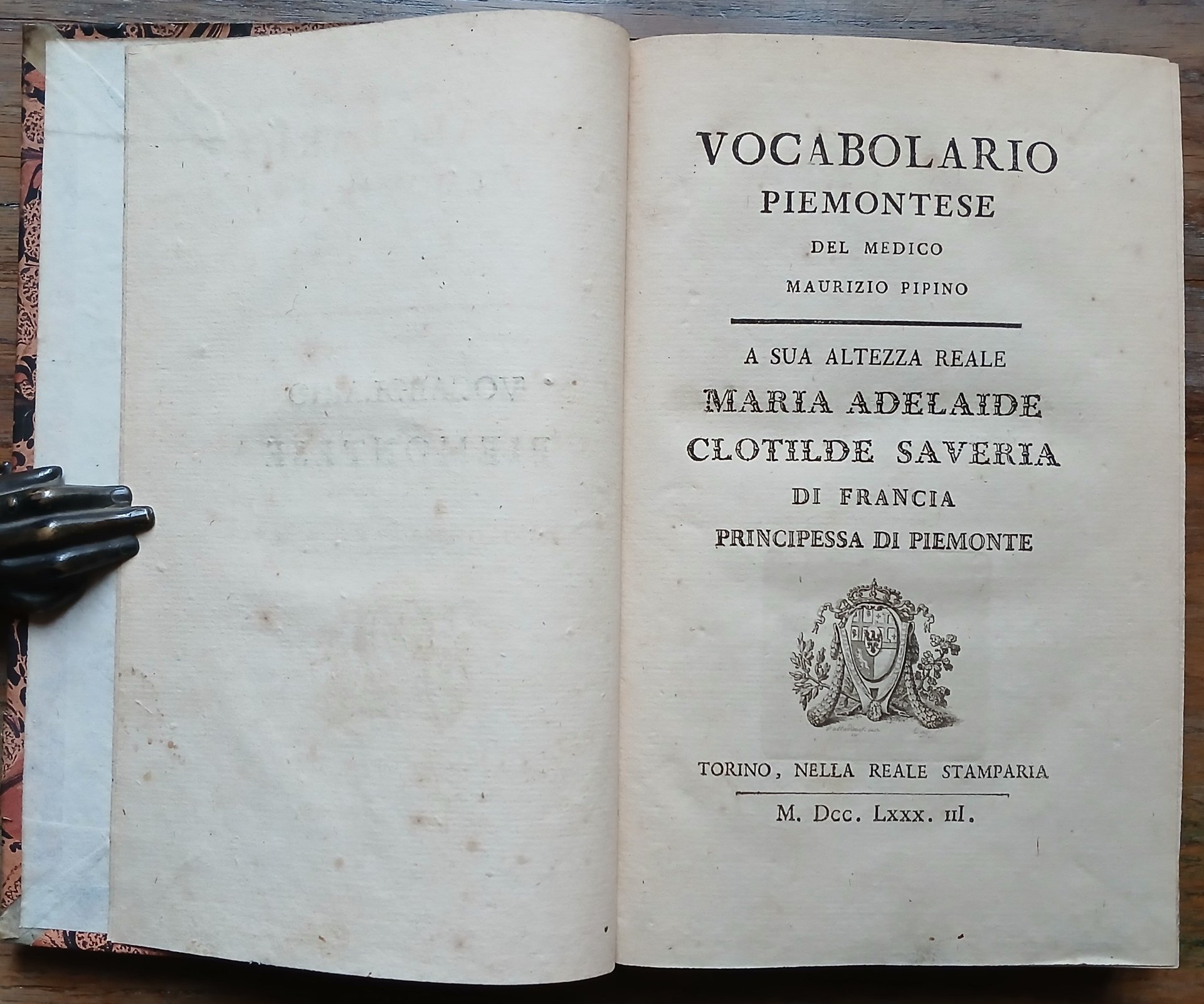 Vocabolario piemontese del medico Maurizio Pipino. A sua altezza reale Maria Adelaide Clotilde Saveria di Francia principessa di Piemonte.