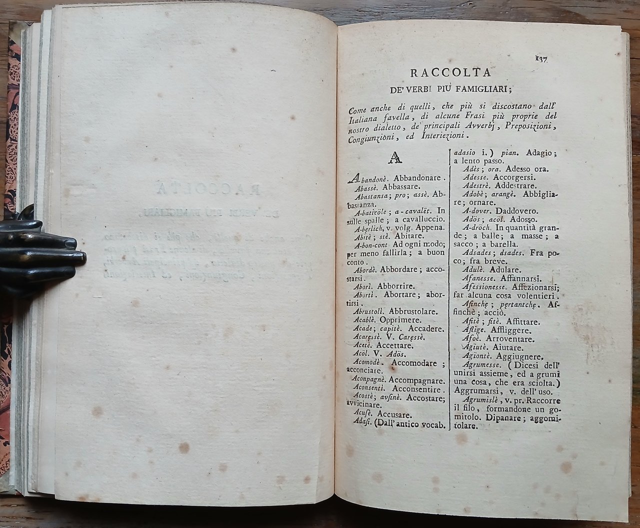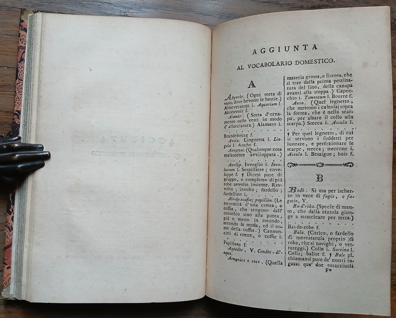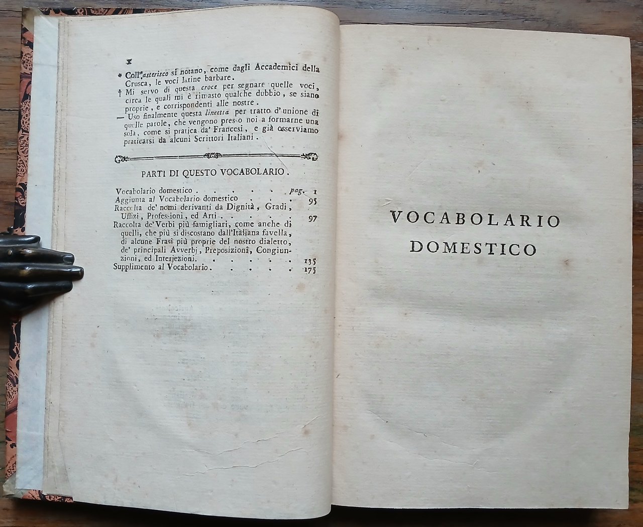 (Lessicografia dialettale - Piemonte) In 8° (cm 20 x 13,2), legatura ottocentesca in mezza pelle, al dorso titoli ed impressioni in oro, carta marmorizzata ai piatti, tagli spruzzati, pp. X,(2),1-95,(13),97-225,(1), con stemma al frontespizio. Parti dell'opera : Vocabolario domestico - Aggiunta al Vocabolario domestico - Raccolta de' nomi derivanti da Dignità, Gradi, Uffizi, Professioni ed Arti - Raccolta de' Verbi più famigliari, come anche di quelli, che più di discostano dall'Italiana favella, di alcune Frasi più proprie del nostro dialetto, de' principali Avverbi, Preposizioni, Congiunzioni, ed Interiezioni - Supplimento al Vocabolario. Ogni parte è separata da dieci carte bianche inserite dal legatore probabilmente per ospitare eventuali annotazioni. Edizione originale, ex libris al risguardo anteriore. Lievi usure e piccole mancanze alla legatura, leggero ingiallimento della carta, peraltro volume ben conservato.