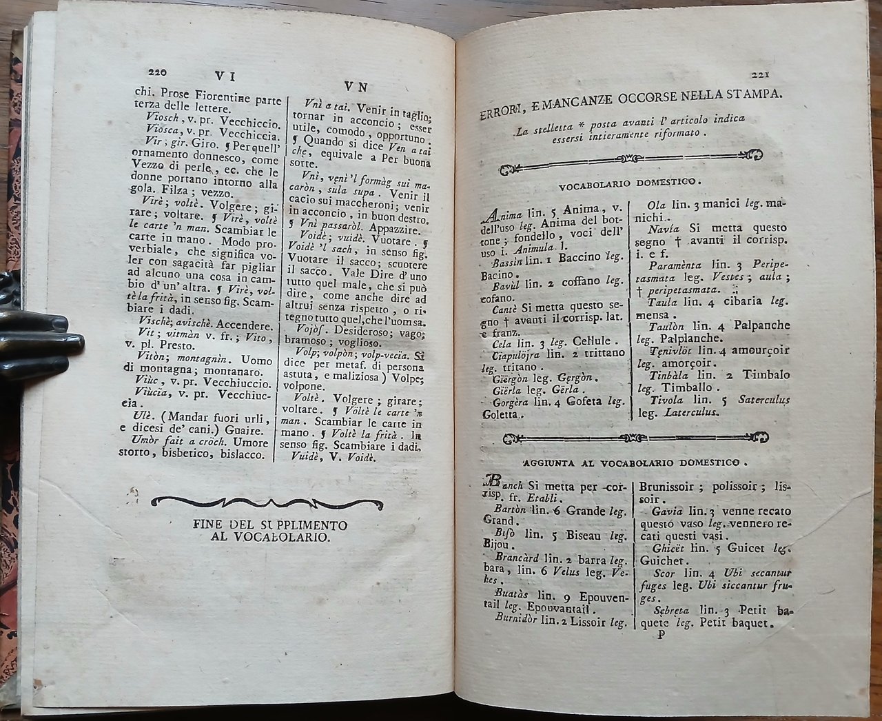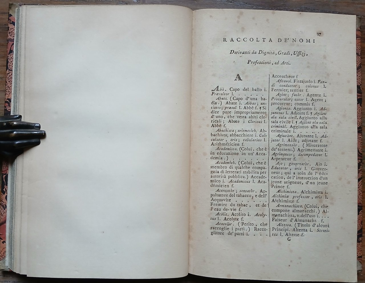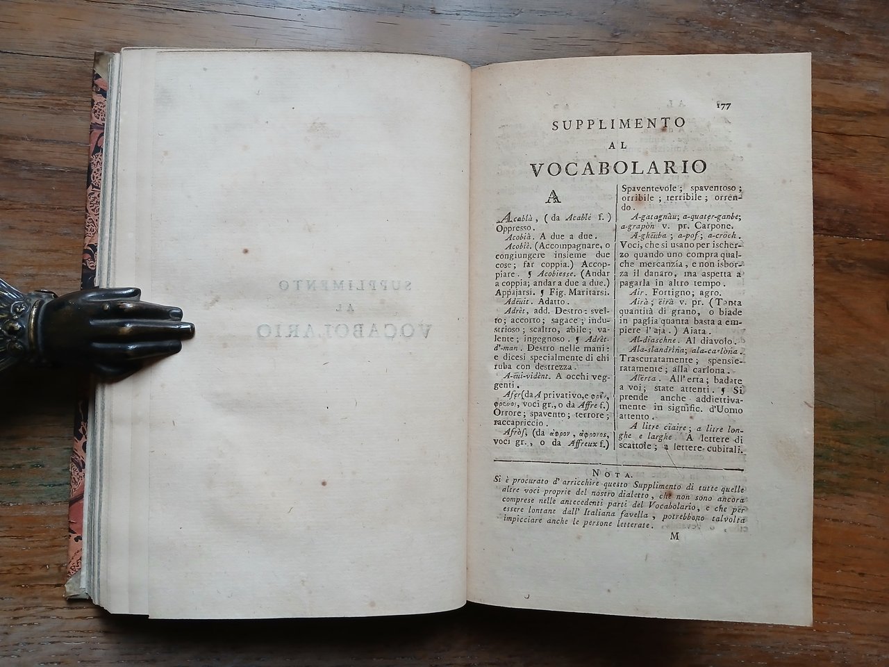 (Lessicografia dialettale - Piemonte) In 8° (cm 20 x 13,2), legatura ottocentesca in mezza pelle, al dorso titoli ed impressioni in oro, carta marmorizzata ai piatti, tagli spruzzati, pp. X,(2),1-95,(13),97-225,(1), con stemma al frontespizio. Parti dell'opera : Vocabolario domestico - Aggiunta al Vocabolario domestico - Raccolta de' nomi derivanti da Dignità, Gradi, Uffizi, Professioni ed Arti - Raccolta de' Verbi più famigliari, come anche di quelli, che più di discostano dall'Italiana favella, di alcune Frasi più proprie del nostro dialetto, de' principali Avverbi, Preposizioni, Congiunzioni, ed Interiezioni - Supplimento al Vocabolario. Ogni parte è separata da dieci carte bianche inserite dal legatore probabilmente per ospitare eventuali annotazioni. Edizione originale, ex libris al risguardo anteriore. Lievi usure e piccole mancanze alla legatura, leggero ingiallimento della carta, peraltro volume ben conservato.