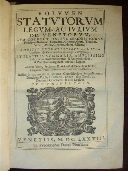 VOLUMEN STATUTORUM LEGUM, ac Iurium DD. Venetorum, cum correctionibus Serenissorum Principum Barbadici, Lauredani, Grimani, Gritti, Trevisani, Venerii, Prioli, Ciconiae, Memi, et Bembi. Additis recentioribus legobus civilibus, et criminalibus summopere necessariis et practica summaria, amplissimo indice omnium rubricarum: et annotationibus et postillis in marginem omnium legum, summo labore et studio. Causidici Veneti, ab innumeris erroribus emendatis. Additis in hac novissima editione corretionibus Serenissorum Principum Prioli, Cantarini, Erizzo, tum Caroli, hac Dominici Contareni et aliis legibus.