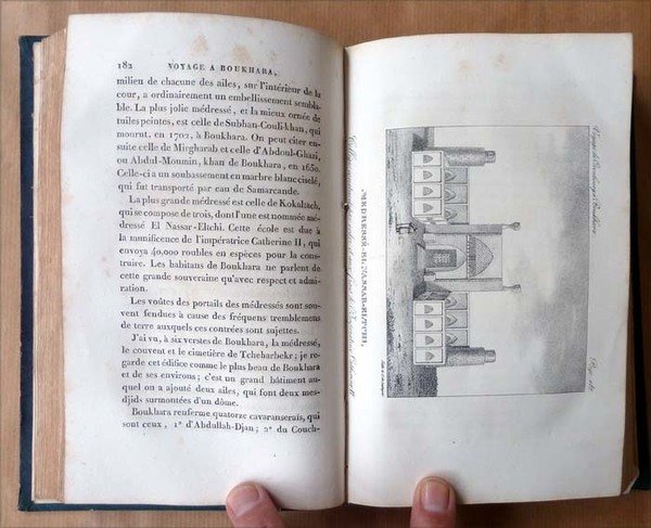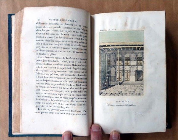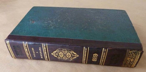 Un volume de format in 8° de XII pp.( faux titre, titre, avertisement, préface de l'auteur); 508 pp.; 4 planches hors texte en couleurs dont le frontispice; et trois en noir; une grande carte dépliantes en fin (rousseurs). Le voyage en lui-même couvre 306 pp.; viennent ensuite de nombreux suppléments d'érudits russes concernant les monnaies les langues, l'histoire naturelle de la Boukharie (sic). Dos lisse richement orné; demi basane violine; titre doré. Brunet III; col.1690. Importante rousseurs sur le titre et le frontispice puis rousseurs éparses plus rares. Bien complet . Parfaitement relié. Ouvrage peu fréquent; voir les photos.
