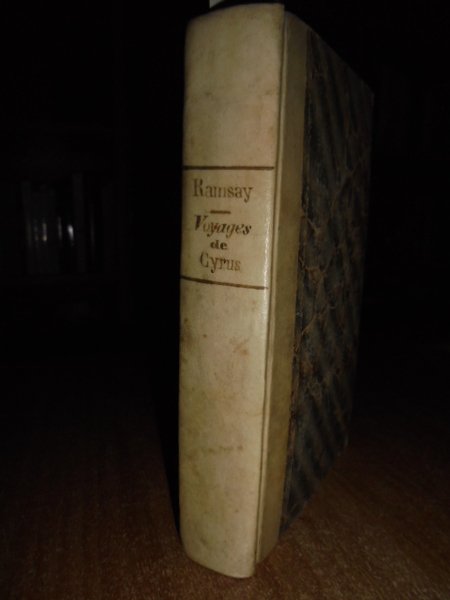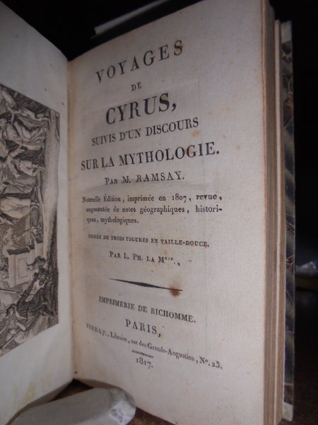 M. Rasmay. Imprimerie de Richomme. Paris, Ferra Je., 1817. Voyages de CYRUS suivis d' un discours sur la Mythologie. Nouvelle édition imprimée en 1807, revue, augmentée de notes géographiques, historiques, mythologiques. Ornée de trois figures en taille-douce. In-16°, m. pergamena coeva con titolo al dorso. xviii, 435, (3) pp. Bell' esemplare. Neg. mob. 14 alto