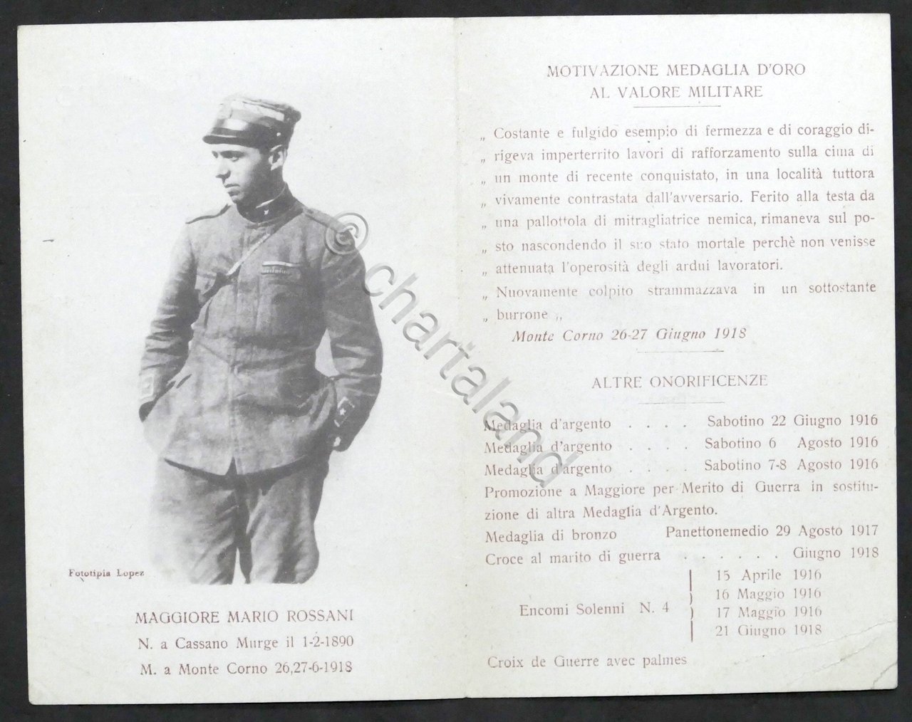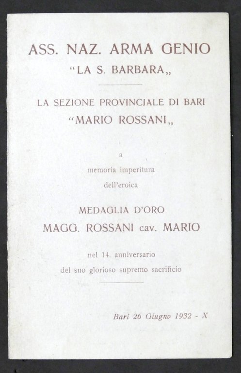 Ass. Naz. Arma Genio "La S. Barbara" - La Sezione Provinciale di Bari "Mario Rossani" Biglietto Commemorativo in memoria della Medaglia d'Oro Mario Rossani - 1932 Deceduto durante la Prima Guerra Mondiale sul Monte Corno nel Giugno 1918 Dimensioni: 9 x 14 cm. Condizioni molto buone.