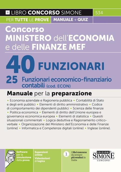 534 CONCORSO MINISTERO DELL'ECONOMIA E DELLE FINANZE MEF 40 FUNZIONARI - 25 FUNZIONARI ECONOMICO-FINANZIARIO CONTABILI (COD. ECON) - MANUALE PER LA PREPARAZIONE