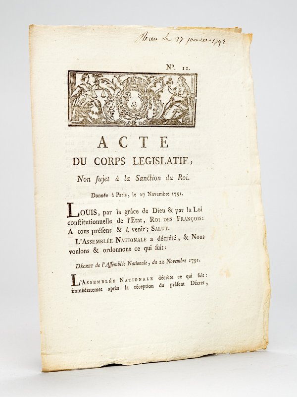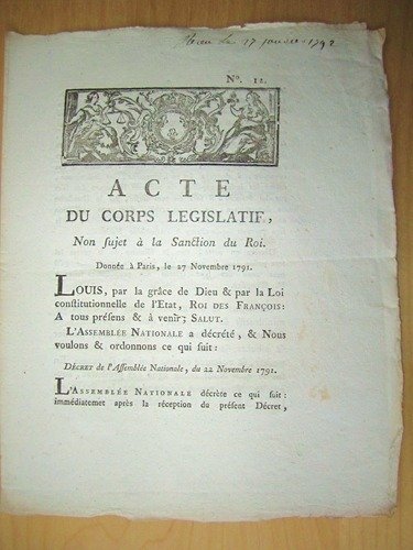 Acte du Corps Législatif, non sujet à la Sanction du Roi. Donnée à Paris le 27 Novembre 1791 : "M. Wimpfen, Marechal-de-camp, sera invité par le Directoire du département du Haut-Rhin, à se rendre dans le lieu de ses séances, pour y passer une déclaration précise des faits relatifs aux propositions de séduction qui lui ont été faites de la part des Princes François émigrés, & dont il a entretenu les Administrateurs du Directoire du département." | Livres anciens et modernes | Collectif