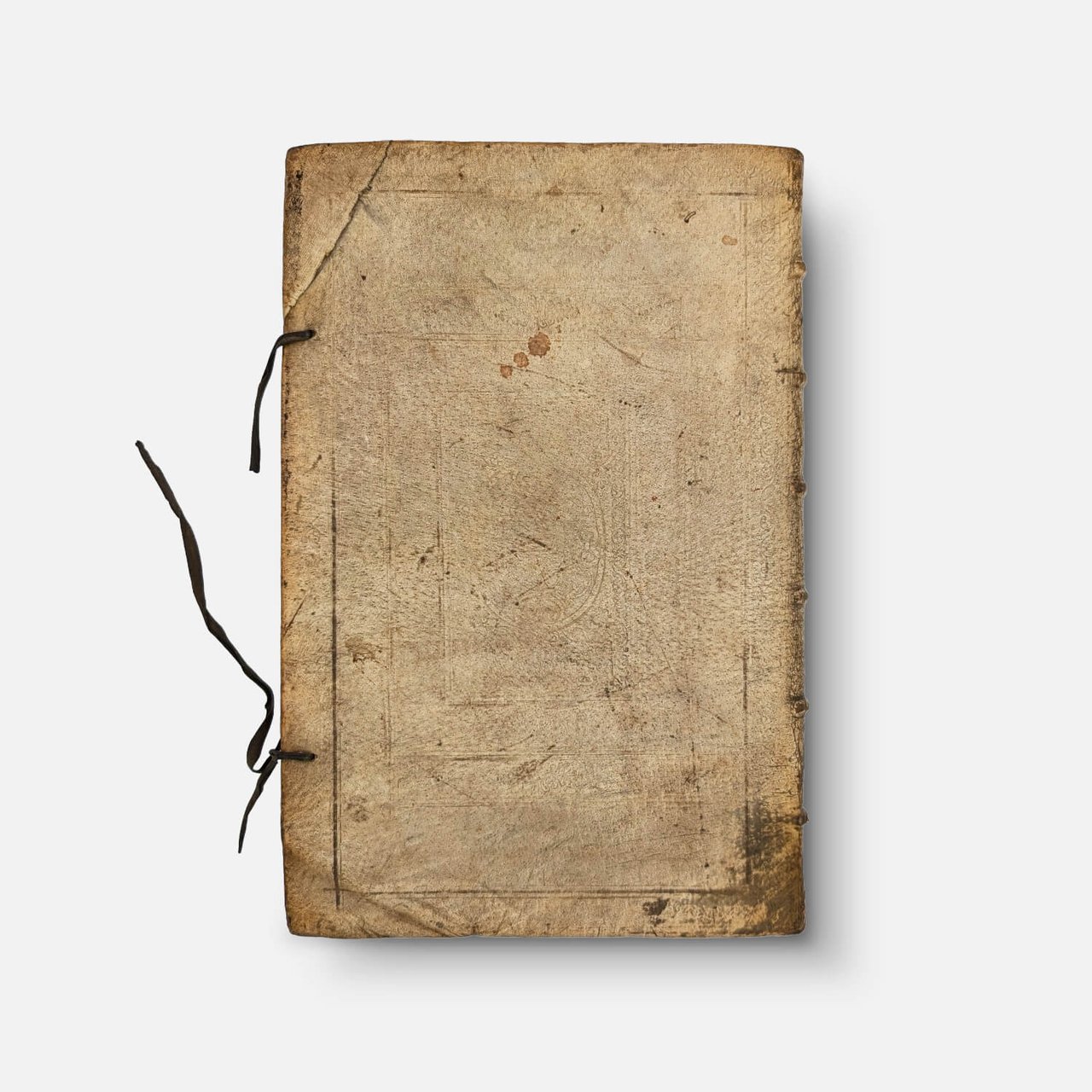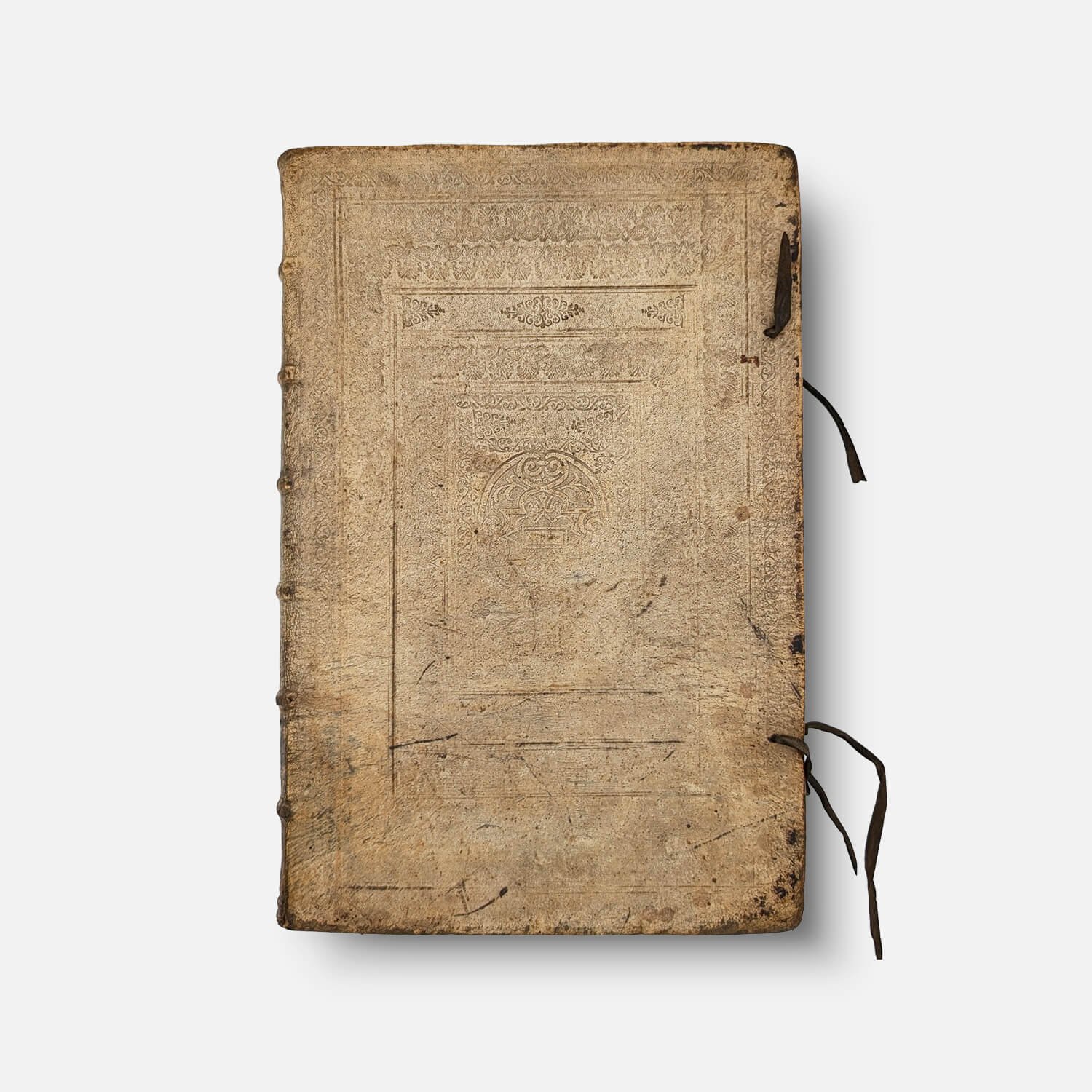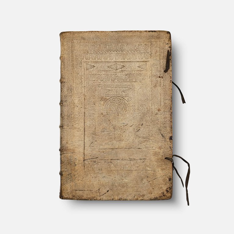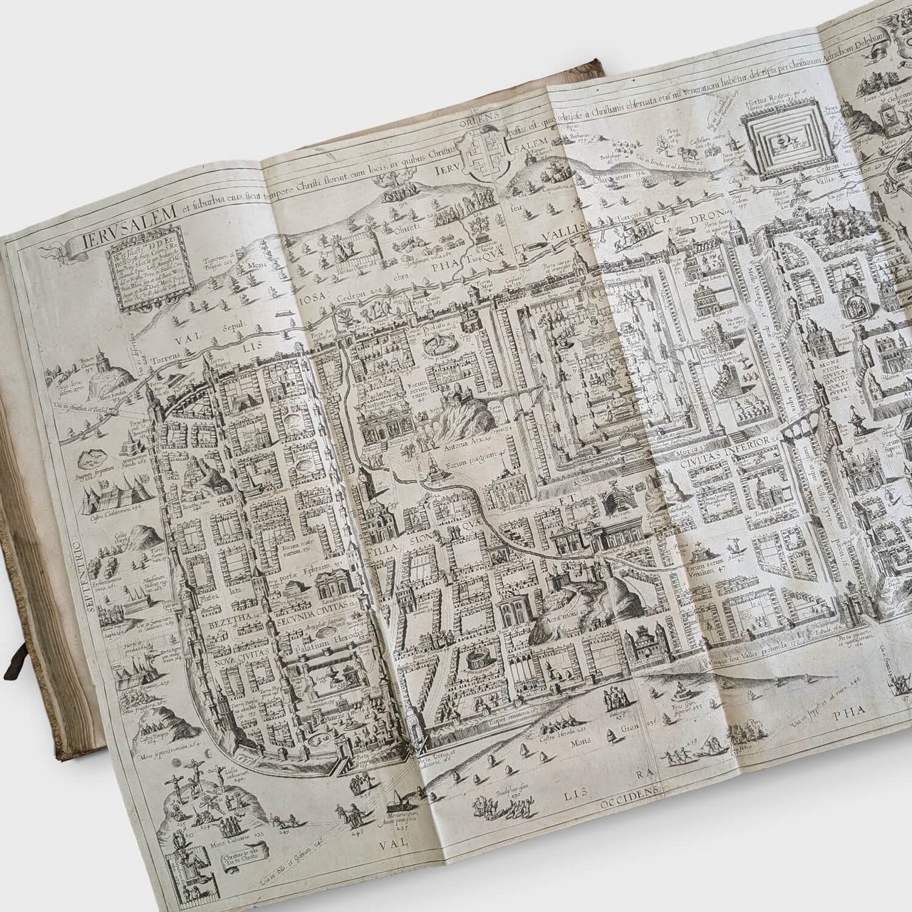 In-folio (38.5 x 25 cm); [1] blank f., engraved title frontispiece, [8] ff., 286 pp., [1] f. Catalogus Auctorum, [12] ff. Index, 1 blank f., 42 pp. Index of names. Text in Latin on 2 columns. Contemporary blind-stamped ivory pigskin with original ties, spine with raised bands and manuscript title. The work begins with the description of the Holy Land with the large map, followed by a description of each territory of the 12 tribes accompanied by mapping. Then comes the detailed plan of Jerusalem and the numbered detail of each building, followed by the Catalogus Auctorum and the Index. Originally published in Cologne in 1590, five years after the death of its author, the Theatrum Terrae Sanctae was reprinted in 1593, 1600, 1613, 1628, 1682, and 1722 (corrected edition of 1682). The first atlas dedicated to the Holy Land, it is Adrichem's most important and famous work.