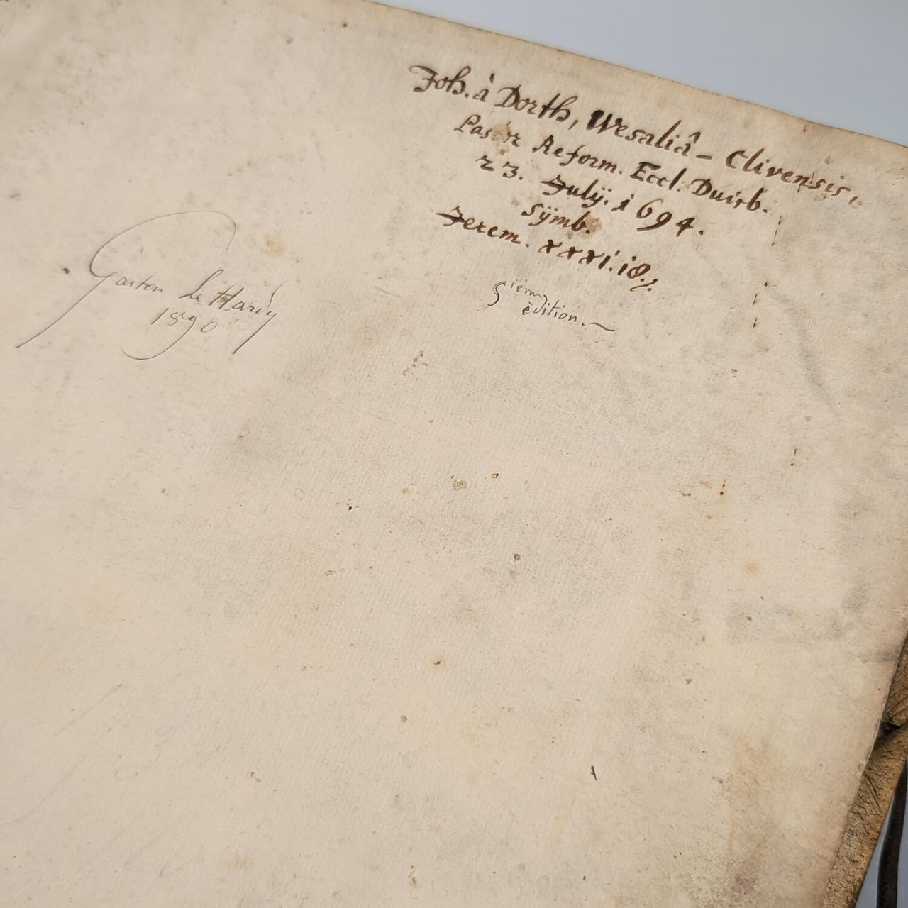 Adrichom's work was so precise and scholarly that it seems to have crossed denominational boundaries. The 1694 ex-libris of Johannes à Dorth, explicitly mentioning that he was a pastor of the Reformed church (Pastor Reform. Eccl. Duirb), is certainly no coincidence. This mention, annotated on a book written by a Catholic, not only highlights its importance for late 17th-century Protestant exegesis but also allows this knowledge to be intellectually associated with Reformed theology, in a context that was certainly still difficult after a century of conflict with the Spanish Catholics and in the midst of the War of the League of Augsburg and the revocation of the Edict of Nantes.