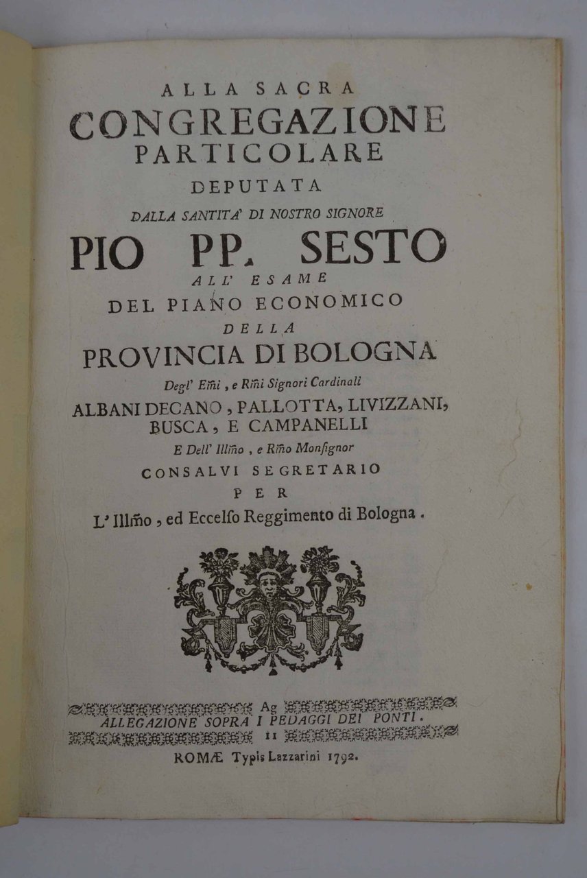 Alla sacra congregazione particolare deputata dalla santità di nostro Signore Pio PP. Sesto all'esame del piano economico della provincia di Bologna Degl Emi, e Rmi Signori Cardinali Albani Decano, Pallotta, Livizzani, Busca, e Campanelli e dll'Illmo, e Rmo Monsignor Consalvi segretario per l'illmo ed Eccelso Reggimento di Bologna. Allegazione sopra i pedaggi dei ponti.