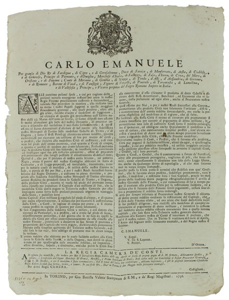 ALLE CONTINUE PESANTI SPESE, A CUI PER CAGIONE DELLE PRESENTI NOTORIE EMERGENZE RESTANO PER ANCO LE NOSTRE REGIE FINANZE PRECISAMENTE A SUCCOMBERE… Dat' in Torino li 29 del mese di Aprile 1736 [Documento originale] | Livres anciens et modernes | Carlo Emanuele Iii.