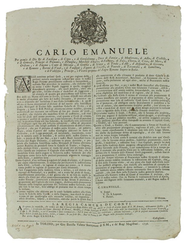ALLE CONTINUE PESANTI SPESE, A CUI PER CAGIONE DELLE PRESENTI NOTORIE EMERGENZE RESTANO PER ANCO LE NOSTRE REGIE FINANZE PRECISAMENTE A SUCCOMBERE… Dat' in Torino li 29 del mese di Aprile 1736 [Documento originale]