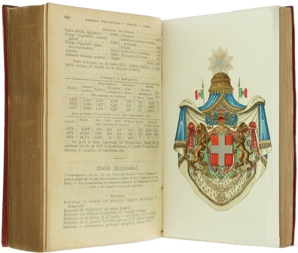 (Codice AD/0059) In 24° (13x9 cm) XXXII-936 pp. Completo con 4 ritratti fuori testo: Marie Thérése, Archiduchesse d'Autriche; Maréchal de Mac Mahon, Duc de Magenta; Marie, Duchesse d'Edimbourg, duchesse de Russie; Alfred, Duc d'Edimbourg. Inoltre bellissimo stemma del Regno d'Italia su tavola a colori, argento e oro. Tela rossa originale, fregi a secco e oro al dorso e al piatto, titolo oro. Buono stato. ~~~ SPEDIZIONE IN ITALIA SEMPRE TRACCIATA