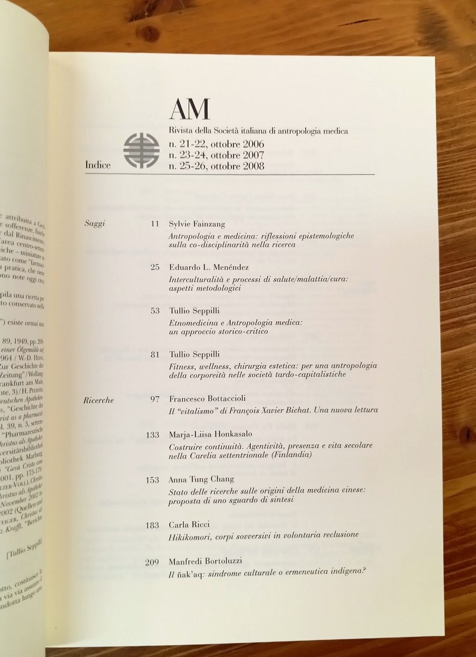 Numero triplo. Brossura editoriale di 553 pagine. Contributi in lingua italiana; indice consultabile nelle nostre immagini. Copia in condizioni di nuovo -- Dall'indice: Fitness, wellness, chirurgia estetica: per una antropologia della corporeità nelle società tardo-capitalistiche - Il "vitalismo" di François Xavier Bichat. Una nuova lettura - Stato delle ricerche sulle origini della medicina cinese: proposta di uno sguardo di sintesi - Hikikomori, corpi sovversivi in volontaria reclusione - Il nak'aq: sindrome culturale o ermeneutica indigena? - Esperienze cliniche sul susto o espanto a Città del Messico - Note per un'epistemologia politica della medicina tradizionale nel Sud del Camerun