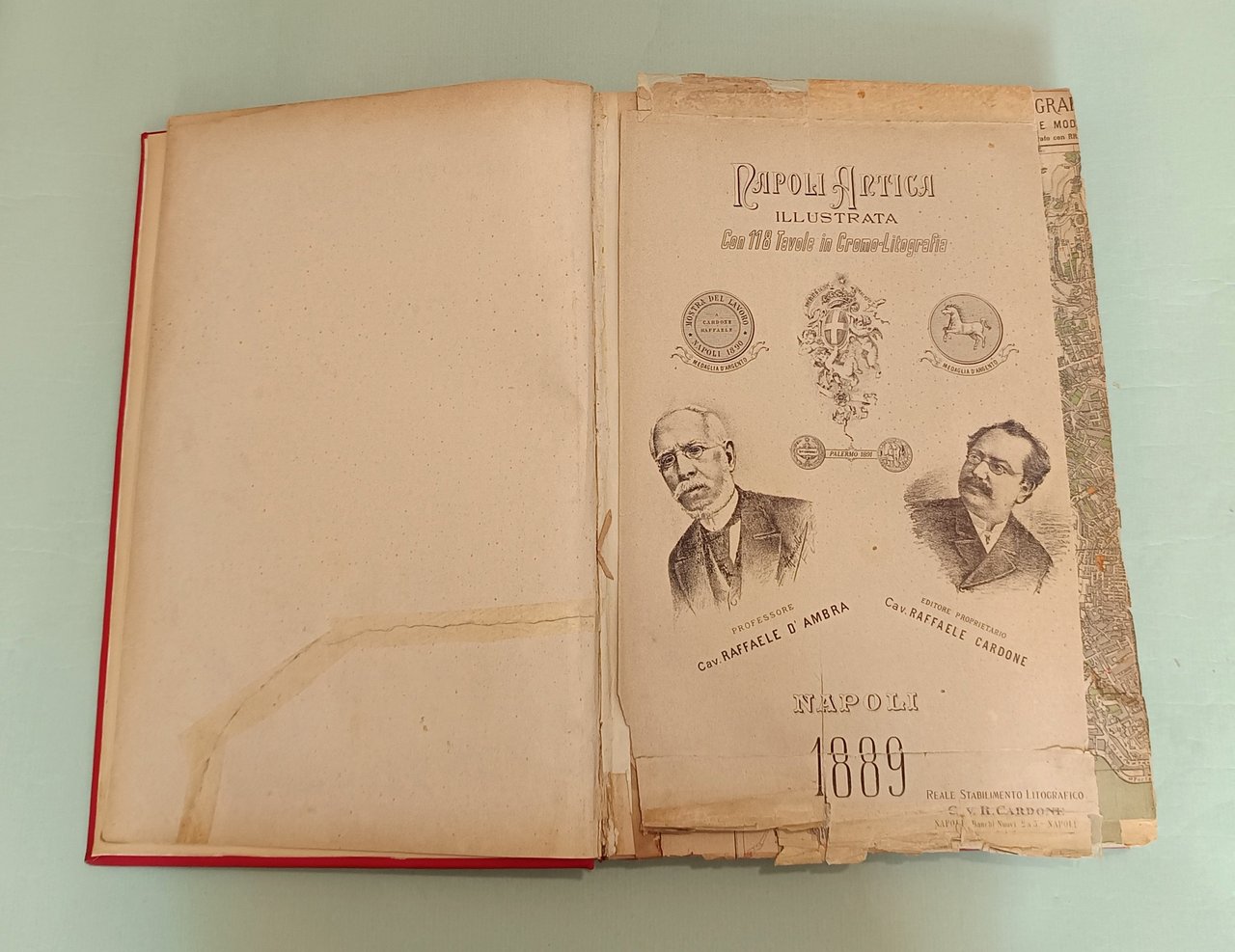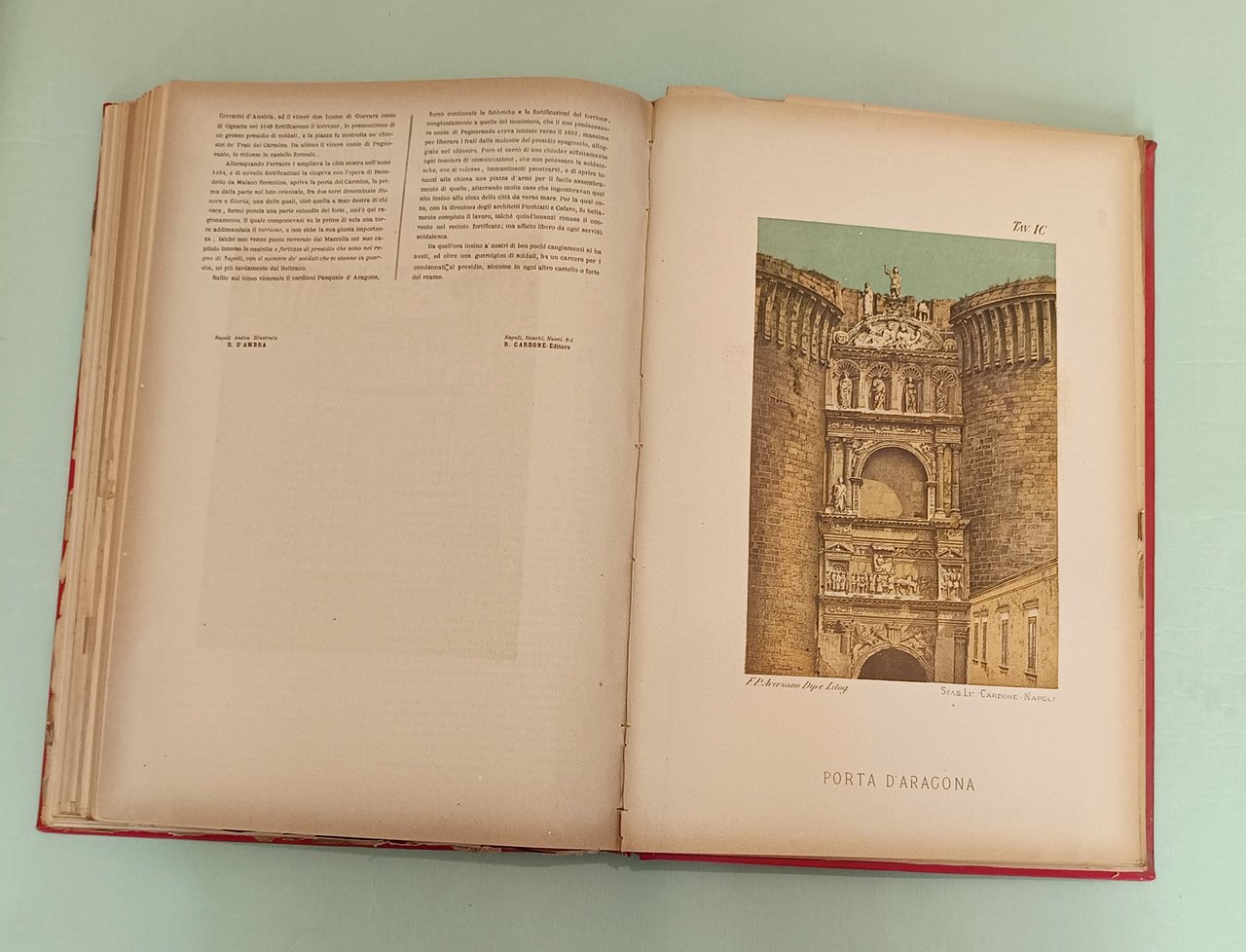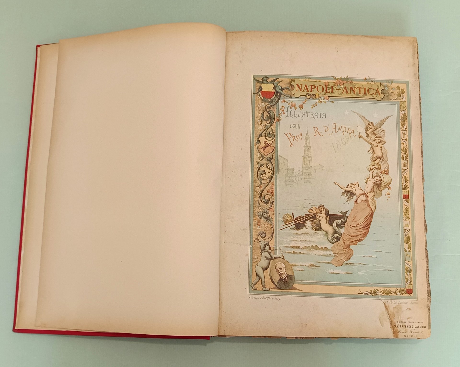 D’AMBRA Raffaele. Napoli antica. Napoli, Cardone, 1889. In folio. Frontespizio con allegorie della Sirena partenopea, racchiuso in fregio a colori con gli stemmi dei quartieri napoletani; tavola con la cerimonia della inaugurazione avvenuta il 15 giugno 1889; tavola spieghevole (con strappi) con la pianta topografica della città di Napoli, al verso i ritratti di D’Ambra e Cardone. Centoquattordici tavole cromolitografate con piazze, monumenti, chiese, strade, fontane, fondaci di Napoli. Opera di valore documentario, ciascuna tavola preceduta da testo esplicativo. Le litografie a carattere popolare sono a colori assai vivi con scene e figure. Legatura in pelle rossa. Tassello al piatto anteriore con titolo e fregi in oro.