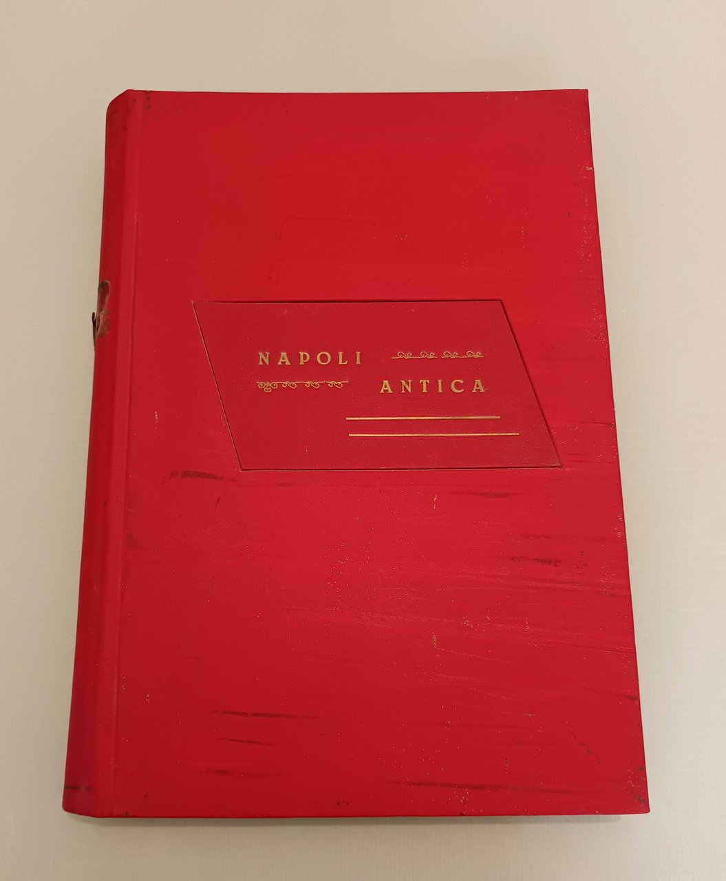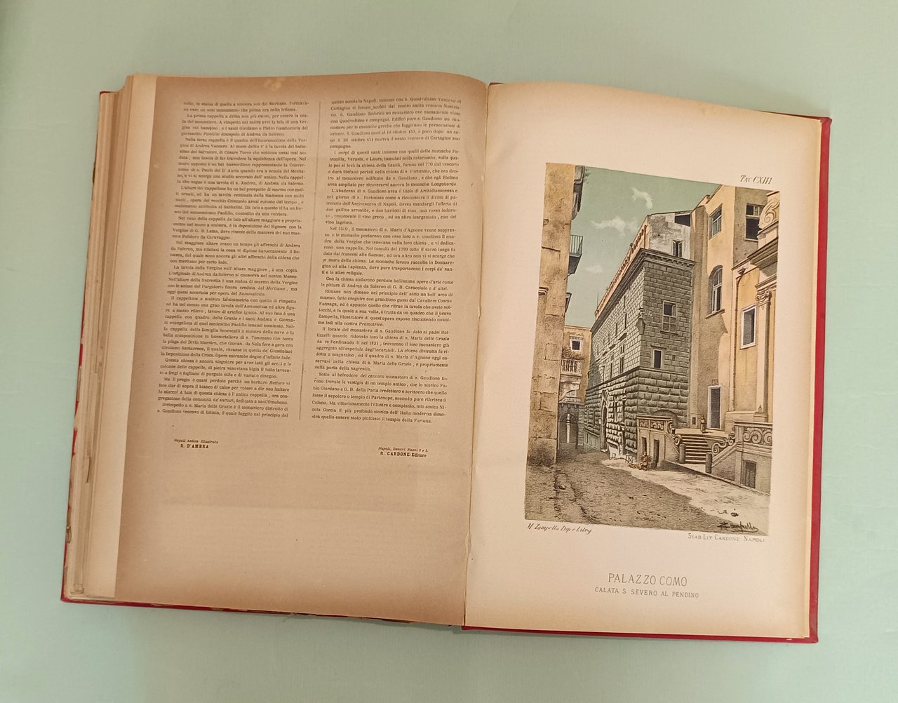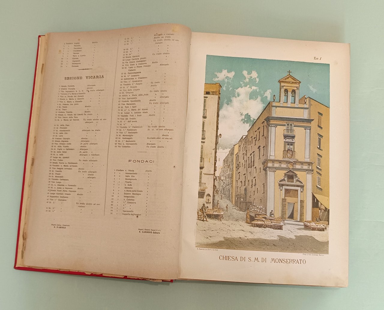 D’AMBRA Raffaele. Napoli antica. Napoli, Cardone, 1889. In folio. Frontespizio con allegorie della Sirena partenopea, racchiuso in fregio a colori con gli stemmi dei quartieri napoletani; tavola con la cerimonia della inaugurazione avvenuta il 15 giugno 1889; tavola spieghevole (con strappi) con la pianta topografica della città di Napoli, al verso i ritratti di D’Ambra e Cardone. Centoquattordici tavole cromolitografate con piazze, monumenti, chiese, strade, fontane, fondaci di Napoli. Opera di valore documentario, ciascuna tavola preceduta da testo esplicativo. Le litografie a carattere popolare sono a colori assai vivi con scene e figure. Legatura in pelle rossa. Tassello al piatto anteriore con titolo e fregi in oro.