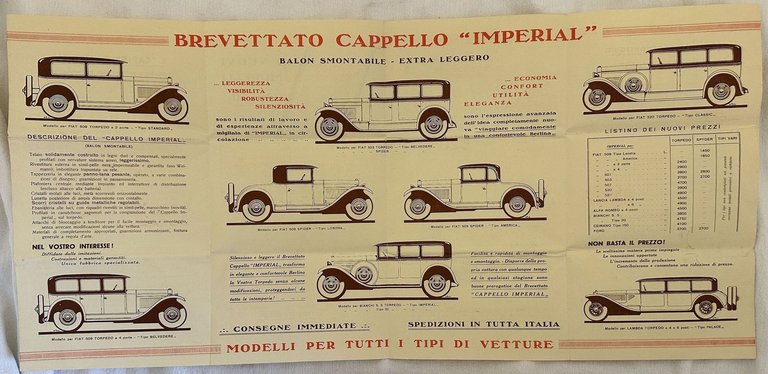 Volantino pubblicitario pieghevole del "Cappello Imperial", un telaio smontabile da applicare sulle vetture coupèe Alfa, Ansaldo, Bianchi, Ceirano, Ford, Itala e O.M. All'interno descrizione con prezzi e illustrazioni. Senza data ma tra la fine degli anni '20 e inizio '30. In buone condizioni. In buone condizioni. Piegatura verticvale e orizzontale. Uno strappo su una facciata. In 4. Dim. 31x16 cm. Pp. (8).Folded advertising pamphlet of "Cappello Imperial", a removable chassis to be applied in coupèe cars Alfa, Ansaldo, Bianchi, Ceirano, Ford, Itala and O.M. Inside description with prices and illustrations. In good conditions. In buone condizioni. Piegatura verticvale e orizzontale. Uno strappo su una facciata. In 4. Dim. 31x16 cm. Pp. (8). In good conditions. In good conditions. Horizontal and vertical folding. One tear on a page In 4. Dim. 31x16 cm. Pp. (8).