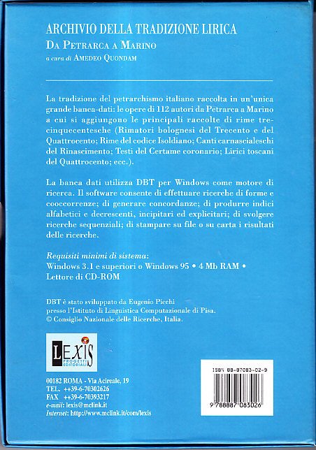 L'opera completa in CD-rom: le opere di 112 autori da Petrarca a Marino a cui si aggiungono le principali raccolte di rime trecinquecentesche (rimatori bolognesi del trecento e del Quattrocento; rime del Codice Isoldianio; canti carnascialeschi del Rinascimento; testi del Certame coronario; lirici toscani del Quattrocento; etc): A cura di A.Quondam. Roma, Lexis Progetti Editoriali, 1997, custodia di cm.15x21, Coll.Archivio Italiano, Strumenti per la Ricerca Storica, Filologica e Letteraria. Lievi tracce d' uso nella parte superiore della custodia, buona copia.