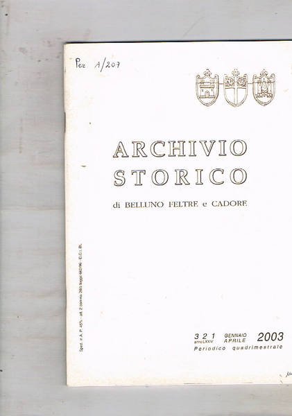 Archivio storico di Belluno Feltre e Cadore, periodico quadrimestrale. Disponiamo dell'annata completa 2003 nei numeri 321, 322, 323 (gennaio-dicembre) più indici dall'anno 1998 all'anno 2003 a cura di Paolo Pellegrini.