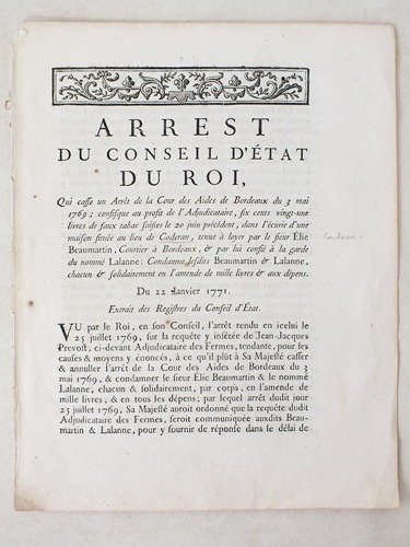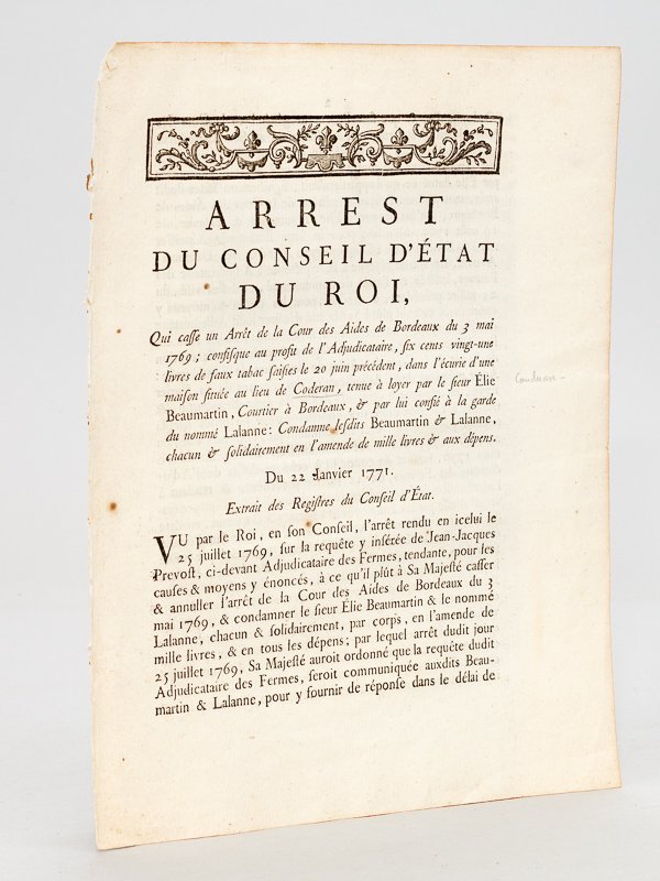 1 brochure in-8, De l'Imprimerie Royale, Paris, 1771, 4 pp. Titre : Arrest du Conseil d'Etat du Roi, Qui casse un Arrêt de la Cour des Aides de Bordeaux, du 3 mai 1769 ; confisque au profit de l'Adjudicataire, six cents vingt-une livres de faux tabac saisies le 20 juin précédent, dans l'écurie d'une maison située au lieu de Codéran [ Caudéran ], tenue à loyer par le sieur Elie Beaumartin, Courtier à Bordeaux, & par lui confié à la garde du nommé Lalanne. Condamne lesdits Beaumartin & Lalanne, chacun & solidairement en l'amende de mille livres & aux dépens. Du 22 janvier 1771. Sur une saisie de faux-tabac à Caudéran (Bordeaux, Gironde), en juin 1768. Etat très satisfaisant (petit mq. en tête).